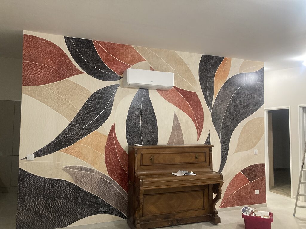 Le colis contenait un seul rouleau, ce qui m’a un peu inquiétée, mais dès que je l’ai ouvert, j’ai vu que l’équipe avait parfaitement découpé mon motif en huit bandes : c’est très facile à découper et à aligner. Je suis ravie du résultat sur mon mur