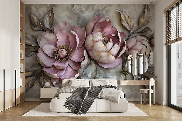 Papier peint Groupe de fleurs blanches avec des feuilles brunes