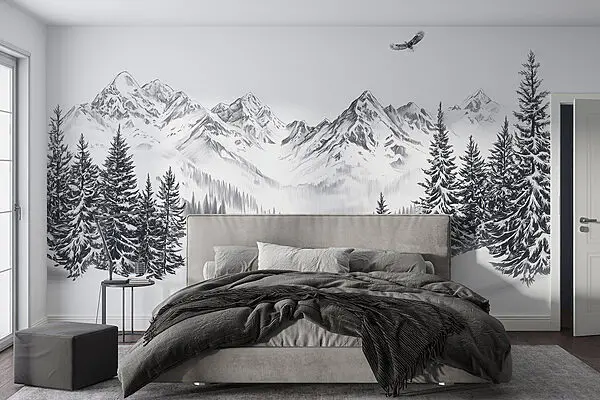 Papier peint Paysage enneigé avec arbres et oiseaux