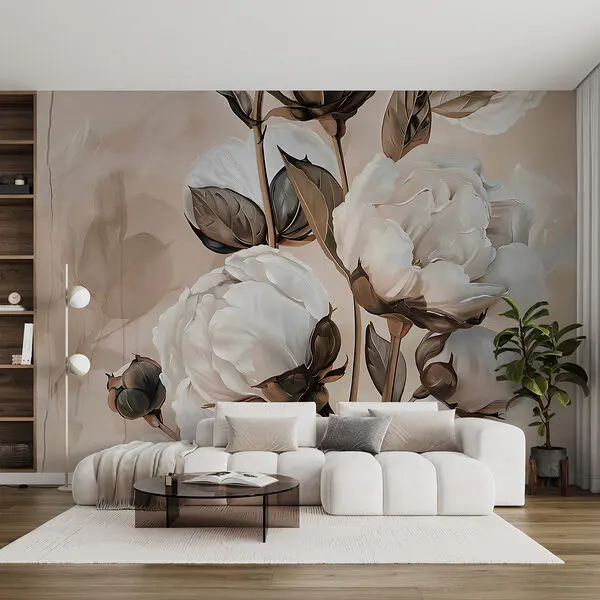 Papier peint Fleurs et feuilles blanches sur fond blanc