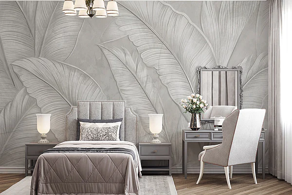 Papier peint Papier peint gris et blanc avec feuilles de palmier