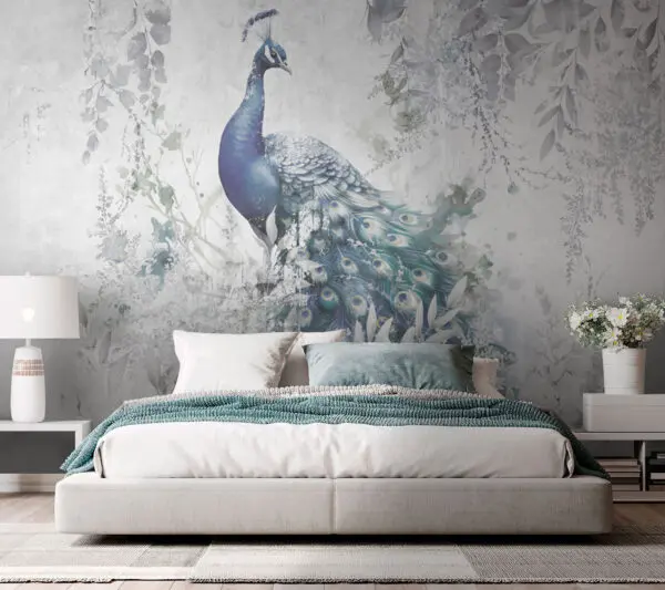 Un papier peint paon moderne aime les lignes pures et le laiton brossé. Pour une ambiance rétro, choisissez un papier peint paon vintage aux tons crème et patinés. Les deux s’intègrent bien à des décors minimalistes.