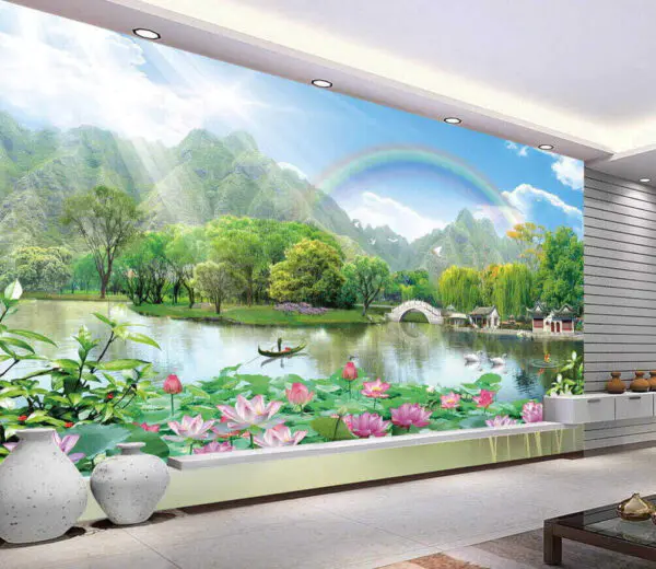 Papier peint Peinture d’une forêt avec des arbres et des montagnes