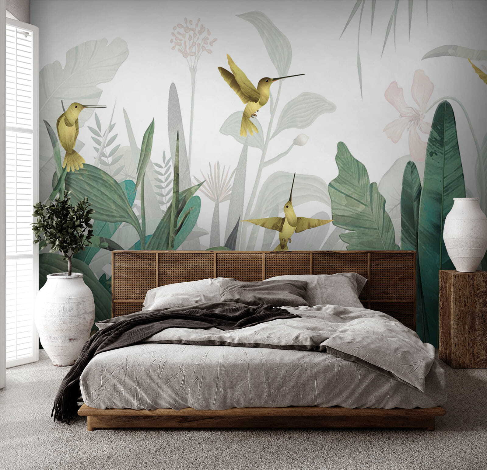 Imaginez que vous entrez dans une pièce et que vous avez l’impression de pénétrer dans un paradis de jungle luxuriante – des colibris virevoltant autour de vous, un feuillage vibrant tout autour de vous. C’est ce que cette peinture murale “Les colibris voltigent au milieu d’un feuillage luxuriant” apporte à un espace. C’est comme une petite tranche de paradis tropical sur votre mur !