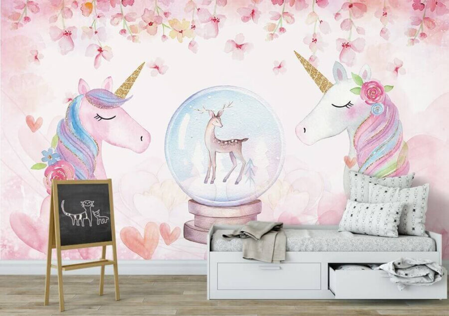 Avec de douces licornes au milieu de teintes florales rose tendre et un superbe cerf dans une boule à neige, cette peinture murale semble tout droit sortie d’un conte de fées. Les teintes douces de l’aquarelle sont apaisantes, tandis que les détails ludiques inspirent l’imagination et la fantaisie.