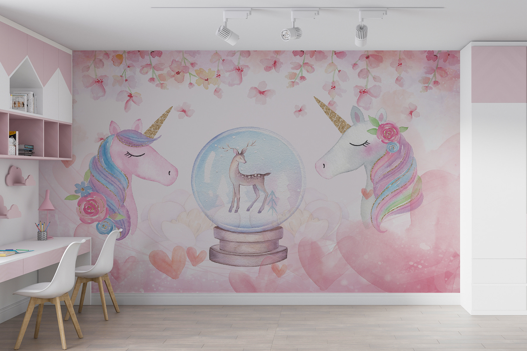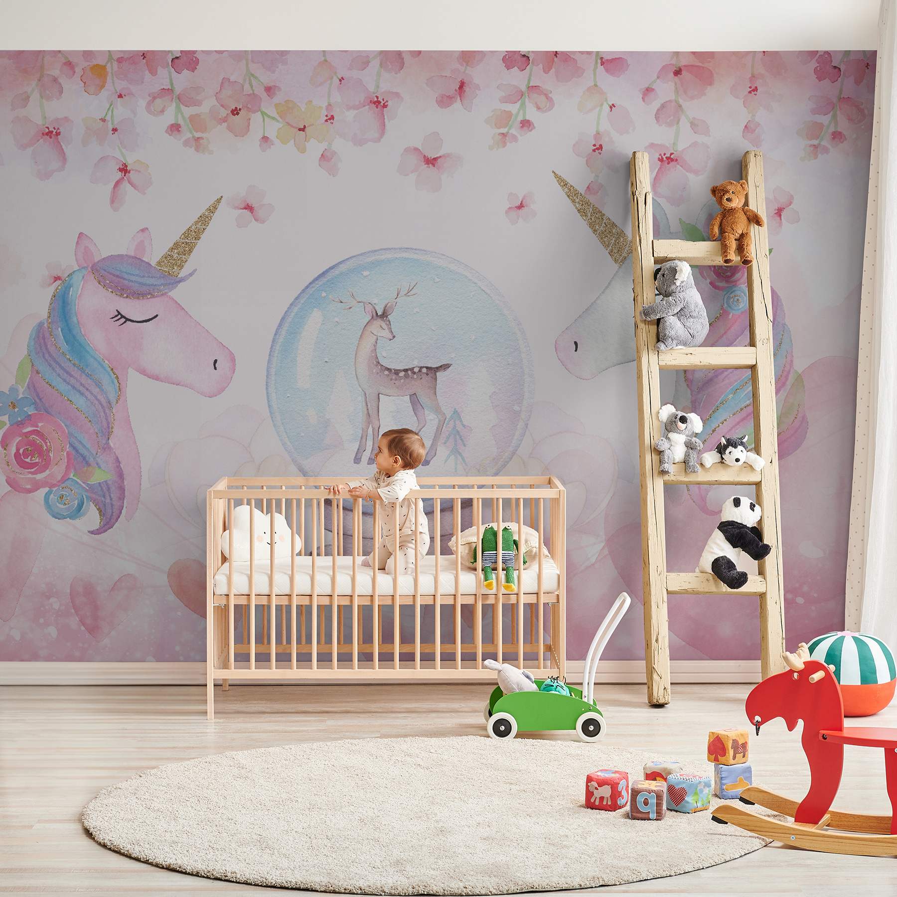 Avec de douces licornes au milieu de teintes florales rose tendre et un superbe cerf dans une boule à neige, cette peinture murale semble tout droit sortie d’un conte de fées. Les teintes douces de l’aquarelle sont apaisantes, tandis que les détails ludiques inspirent l’imagination et la fantaisie.