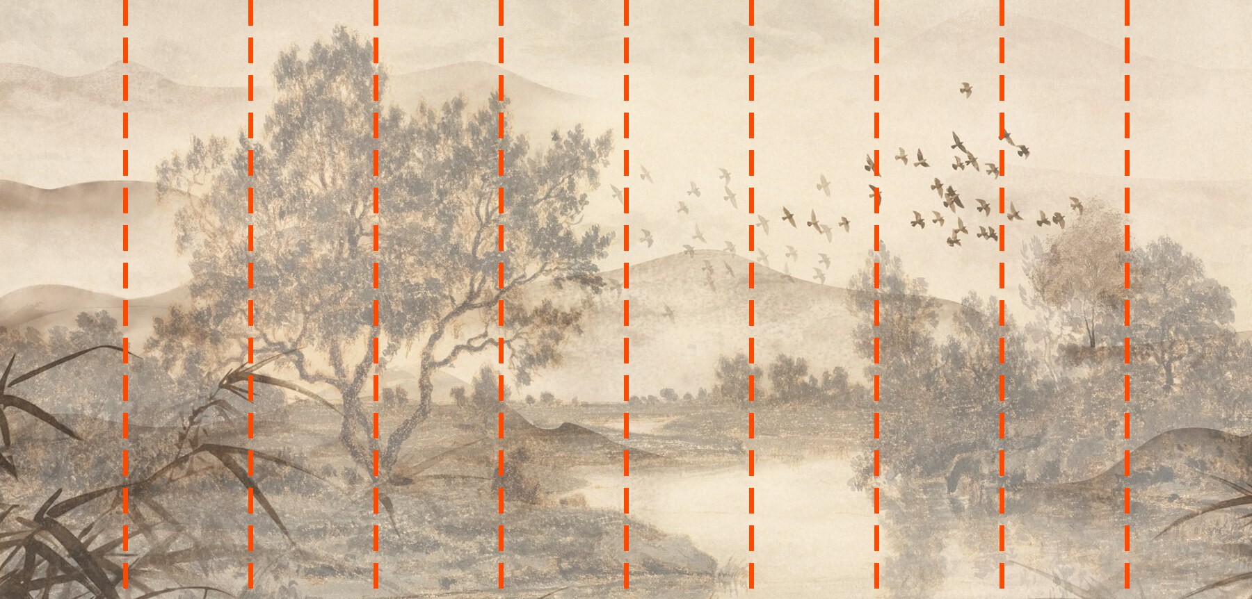 Votre papier peint sera préparé selon les dimensions que vous avez indiquées lors du processus de commande. La toile sera divisée en sections pratiques, chacune d’une largeur maximale de 50 cm.