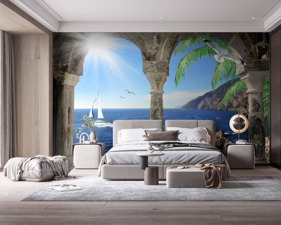 Entrez dans un petit coin de paradis avec la fresque murale « Vue sur l’océan depuis une arche en pierre ». Imaginez-vous vous réveiller au son doux des vagues et à l’odeur de l’air salé, tout cela depuis le confort de votre salon. Cette fresque murale crée une petite évasion, donnant l’impression qu’il fait toujours beau juste devant votre porte. Ces mouettes qui planent et ce charmant voilier s’harmonisent parfaitement avec le doux balancement des palmiers, qui murmurent la détente. C’est comme partir en vacances sans avoir à faire ses valises ! Idéal pour tous ceux qui aiment le charme du bord de mer et souhaitent rendre leur intérieur un peu plus magique. Imaginez toutes les conversations que cela va susciter : qui n’aime pas les belles histoires de plage ? Et en plus, pas besoin de crème solaire !