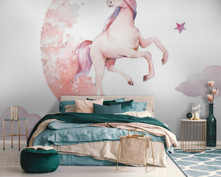 Transformez n’importe quel espace avec cette peinture murale fantaisiste représentant une licorne sautant élégamment au-dessus de la lune. Parfaite pour les chambres d’enfants ou pour tous ceux qui ont un faible pour la magie, elle ajoute une touche d’émerveillement aux murs. Imaginez des soirées douillettes passées à lire des histoires à l’heure du coucher, la douce présence de la licorne inspirant des rêves de pays enchantés et de nuages doux. Les roses enjoués et les vibrations nocturnes rêveuses ne manqueront pas de susciter la joie. Qui ne voudrait pas d’un peu de magie dans sa maison ? C’est comme avoir un morceau de conte de fées à portée de main, qui ne demande qu’à inspirer l’aventure !