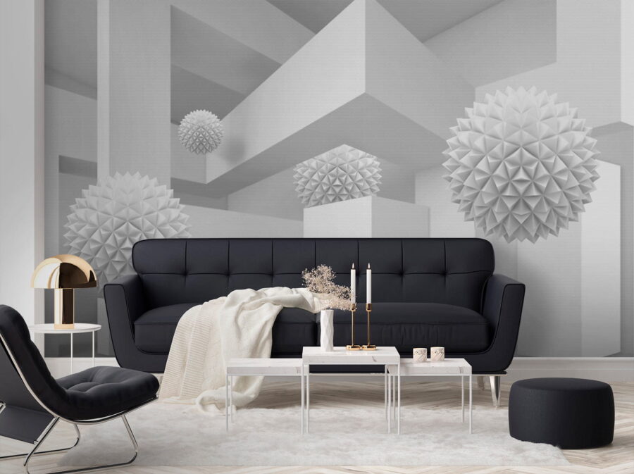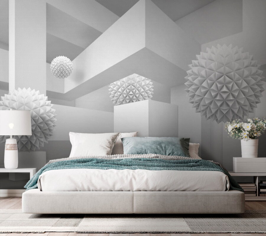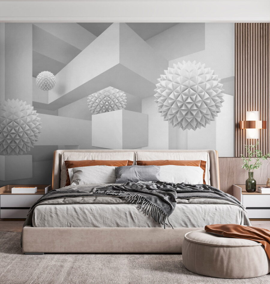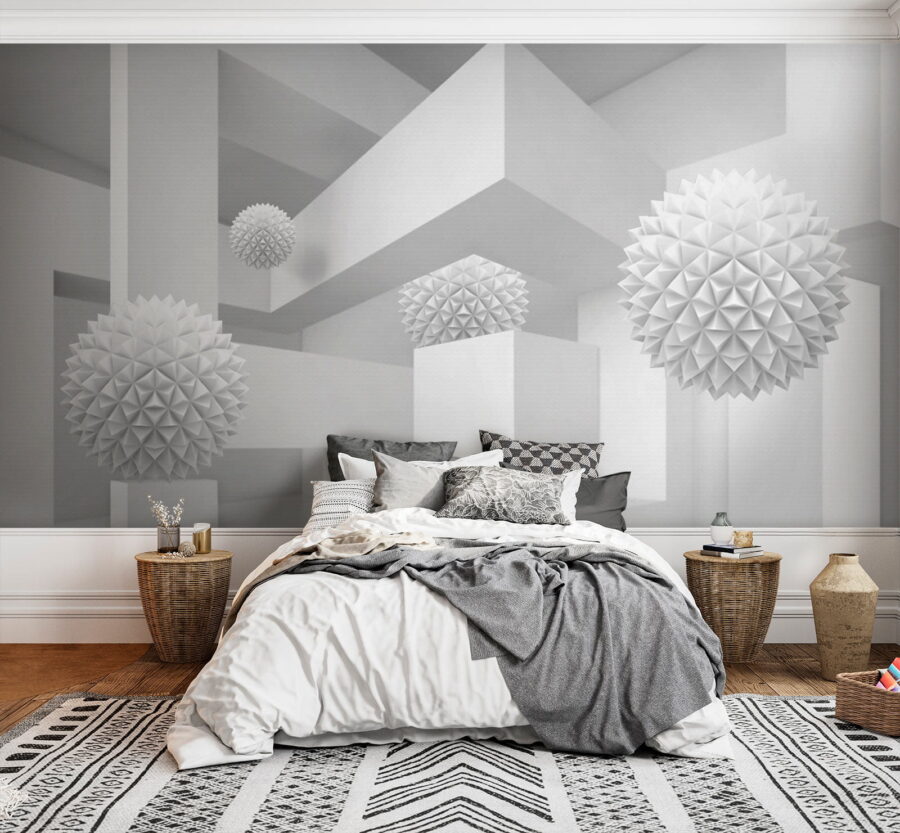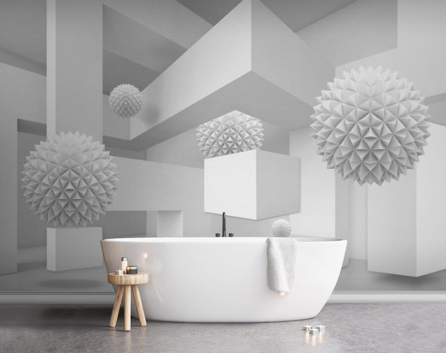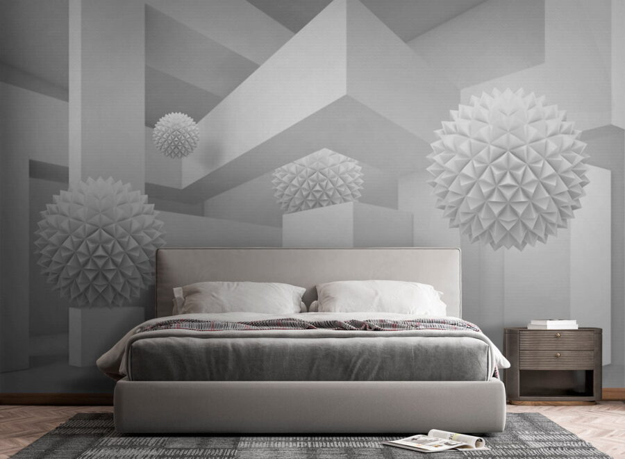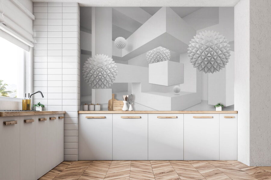 Imaginez que vous pénétrez dans un espace serein et rêveur où le blanc est à l’honneur. Cette peinture murale, qui représente une pièce propre et lumineuse remplie de boules tridimensionnelles excentriques, ressemble à une aventure fantaisiste dans la simplicité. Les formes ludiques se détachent de la toile de fond, invitant à des regards curieux et à de doux sourires. Parfaites pour un salon moderne ou un coin créatif, elles transforment n’importe quel mur en sujet de conversation. Imaginez que vous recevez des amis, que leurs yeux s’illuminent de perplexité et que leurs rires fusent lorsqu’ils essaient de comprendre l’histoire qui se cache derrière ces formes flottantes. Il ne s’agit pas seulement d’une peinture murale, mais d’une expérience qui ne demande qu’à être vécue.