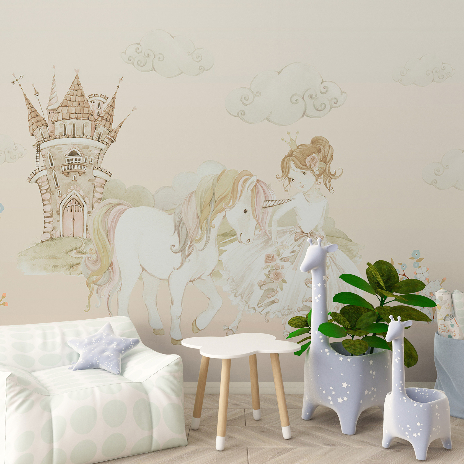 Imaginez un mur qui vous transporte directement dans un conte de fées fantaisiste – un château au loin, une princesse avec sa fidèle licorne à ses côtés. Cette peinture murale vous plonge dans une histoire de rêve à chaque fois que vous entrez dans la pièce. Les pastels doux et les détails délicats sont tout simplement… magiques. Parfait pour une chambre d’enfant ou pour tous ceux qui aiment un peu d’enchantement dans leur vie. De plus, ces nuages duveteux et ces jolies fleurs ? Ils donneront à chaque jour l’impression d’être une journée ensoleillée au pays des contes de fées. C’est une pièce qui stimule l’imagination et les sourires instantanés !