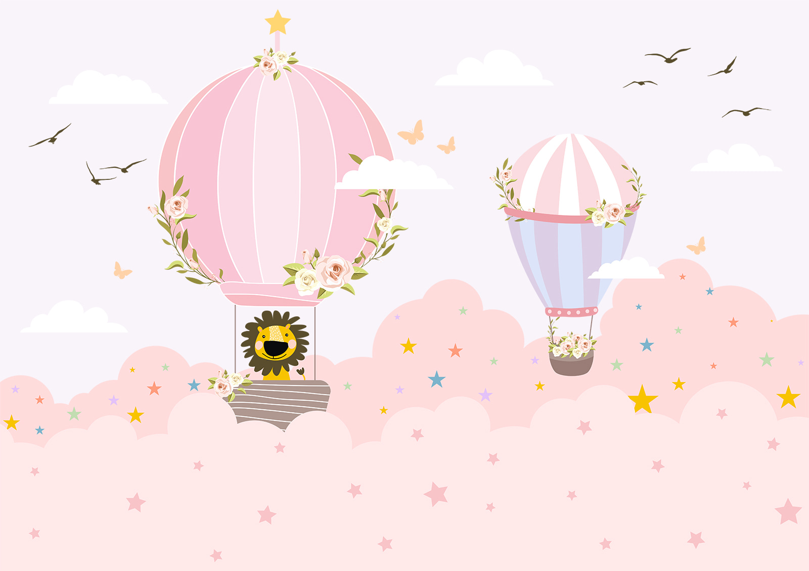 Imaginez un monde où des montgolfières fantaisistes flottent dans un ciel couleur barbe à papa, et où un petit lion espiègle sourit depuis son panier raffiné. Cette fresque murale donne vie à cette vision, enveloppant n’importe quelle pièce d’une atmosphère charmante. Parfaite pour une chambre d’enfant ou une salle de jeux, elle suscite la joie et l’imagination, donnant à chaque jour un air d’aventure. Les enfants pourraient bien croire qu’ils volent à travers les nuages de leurs rêves. Qui ne voudrait pas profiter d’un peu de cette magie ? Avec ses teintes pastel et ses détails ludiques, cette fresque murale est une invitation à rêver un peu plus longtemps. Laissez-vous séduire par sa fantaisie et laissez ses couleurs transformer votre espace !