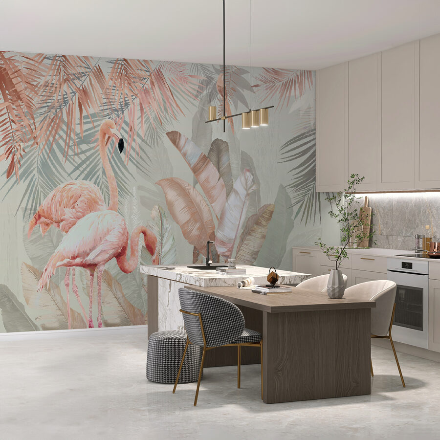 Cette peinture murale est idéale pour les personnes qui ont besoin de s’évader de l’agitation quotidienne ou qui aiment tout simplement les flamants roses (qui ne les aime pas, n’est-ce pas ?). Il vous enveloppe dans un monde de verdure et de tranquillité, faisant de votre maison un havre de paix, une sorte de sanctuaire de la jungle. Préparez-vous à ressentir le bonheur et le calme que cela vous apporte chaque jour !