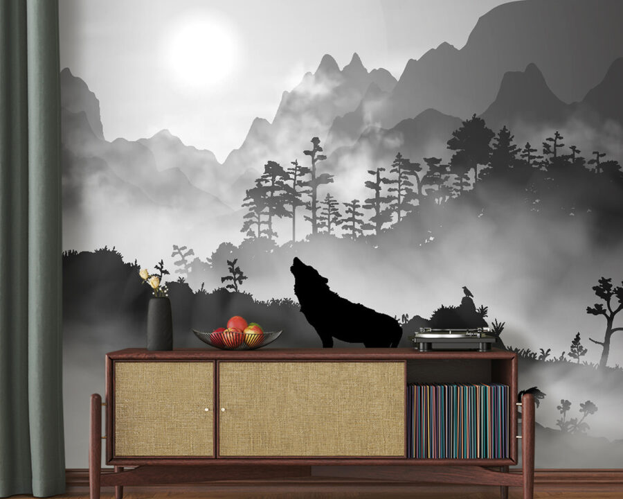 Imaginez-vous entrer dans une pièce confortable où trône une superbe fresque murale représentant un loup hurlant à la lune. Ce n’est pas n’importe quelle fresque murale, c’est comme un poème de la nature sur votre mur. Les montagnes douces et brumeuses et les silhouettes des arbres créent un décor serein, apaisant les pensées vagabondes pour laisser place à un esprit paisible.