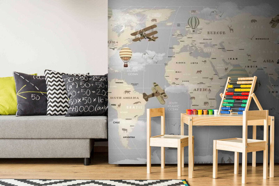 Transformez n’importe quelle pièce en un voyage fantaisiste grâce à la fresque murale « Carte du monde avec avions et montgolfières ». Imaginez-vous dans un espace qui éveille votre envie de voyager, avec ses tons subtils et rêveurs et ses motifs ludiques qui dansent au-dessus des continents. Chaque montgolfière et chaque avion ajoute une touche d’aventure. Qui ne rêverait pas de voyager à travers le monde tout en sirotant un café ?