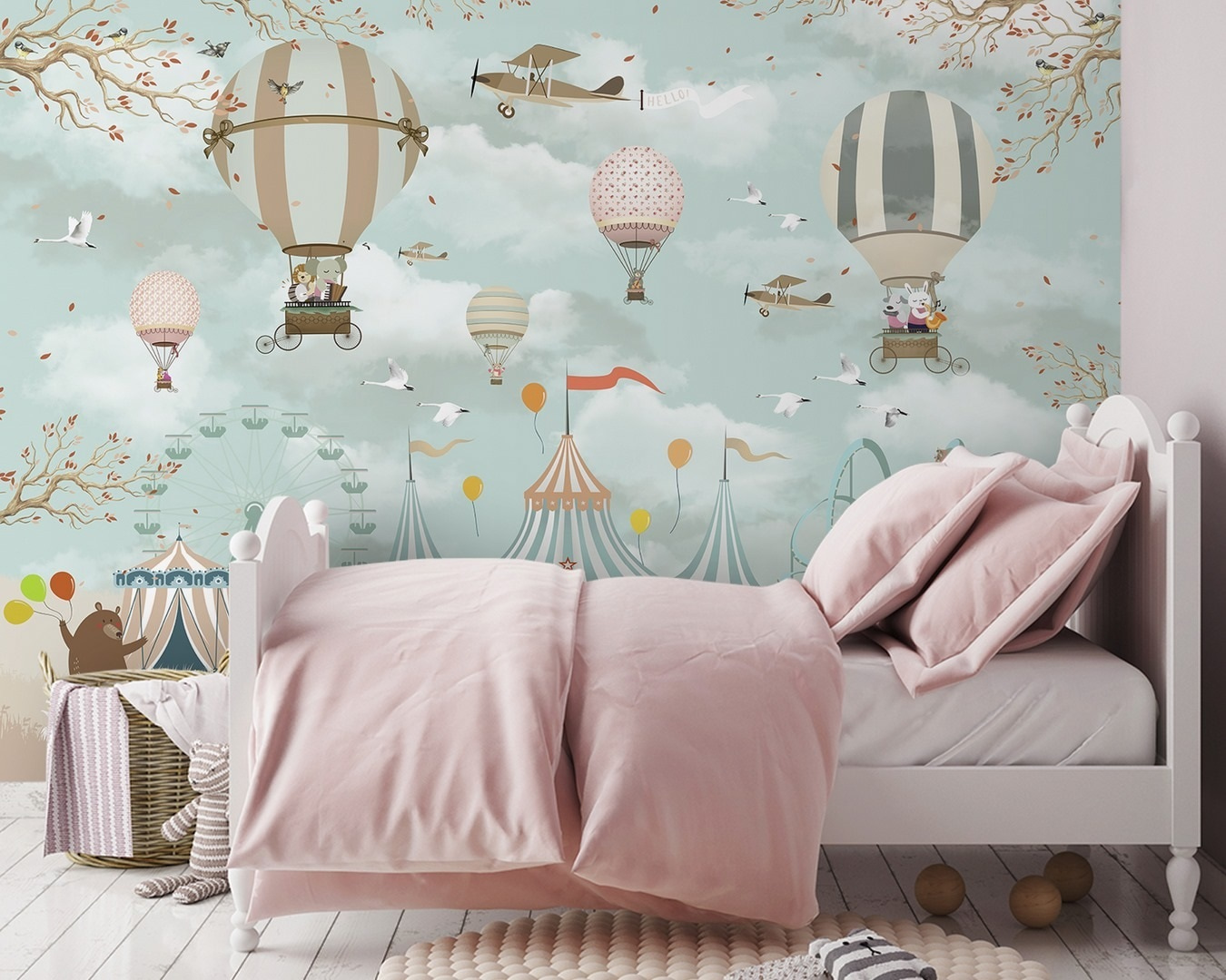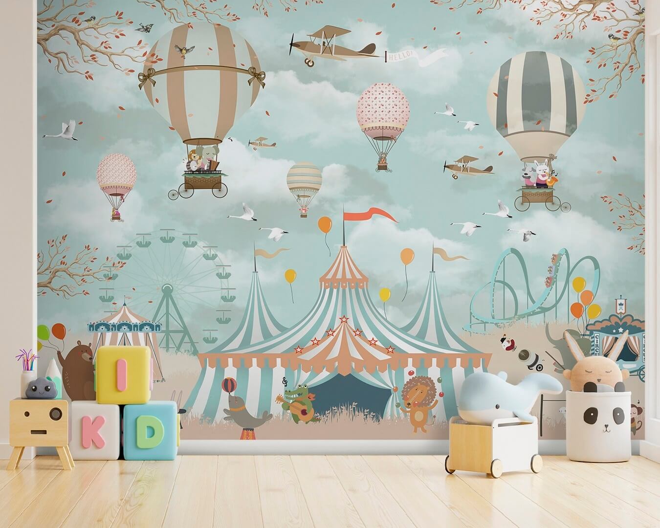 Imaginez que vous entrez dans un espace qui ressemble à une aventure fantaisiste. Cette peinture murale, qui met en scène de charmantes montgolfières et des oiseaux espiègles, crée un ciel délicieux où l’imagination s’envole. Chaque personnage apporte un peu de joie, suscitant des histoires et des rêveries, qu’il s’agisse d’un éléphant courageux ou d’un ours pimpant avec des ballons. Parfait pour une chambre d’enfant ou tout autre endroit qui aurait besoin d’une touche de fantaisie, ce tableau évoque les souvenirs d’enfance des sorties au cirque et des journées ensoleillées passées à l’extérieur. Transformez le mur et laissez la magie s’envoler. Qui n’aurait pas envie de s’évader sous ce ciel enchanteur ?