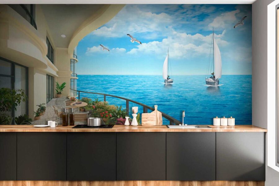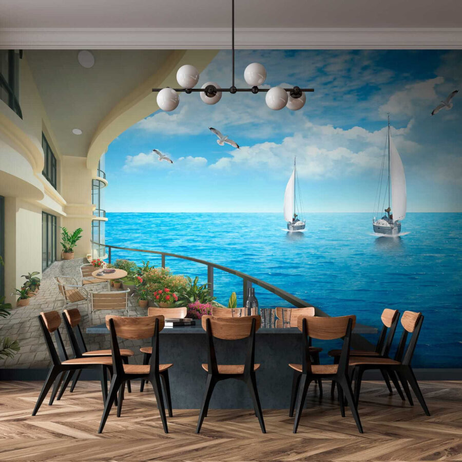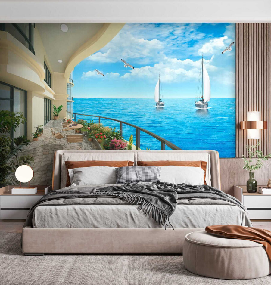 Imaginez que vous entrez dans une pièce où les murs apportent la brise de l’océan jusqu’à vos sens. Cette peinture murale, qui représente un balcon avec une vue imprenable sur l’océan et des bateaux dérivant paresseusement sur l’eau, transforme n’importe quel espace en une retraite côtière. Imaginez que vous sirotiez votre café du matin avec la symphonie des vagues et des oiseaux de mer dans l’air – qui n’en voudrait pas ? Les bleus éclatants et la verdure luxuriante invitent à la détente. C’est comme si vous passiez des vacances sans fin à la maison, en donnant aux murs une bouffée d’air marin frais. Parfait pour les rêvasseurs et tous ceux qui ont besoin de tranquillité dans leur vie. Il suffit de l’accrocher et de laisser les vagues déferler !