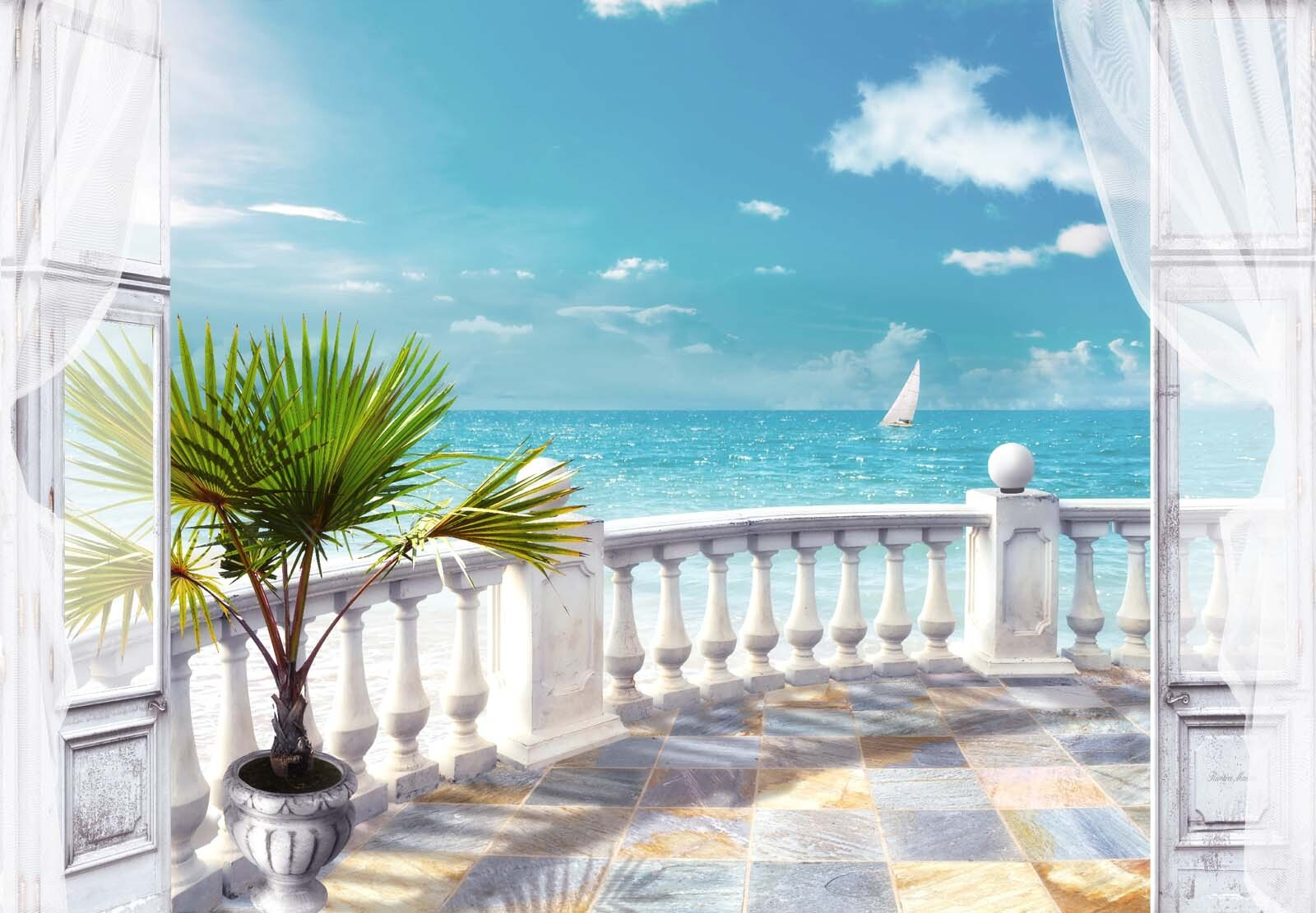 Imaginez que vous vous réveillez chaque matin avec une vue sereine sur le bord de mer – c’est comme si vous vous échappiez chez vous. Cette peinture murale, “Palmier en pot sur un balcon”, apporte ce charme côtier décontracté dans n’importe quelle pièce. Une brise semble passer par la porte ouverte, faisant bruisser les feuilles du palmier. Le voilier au loin, sous des nuages blancs et cotonneux, ajoute une touche de sérénité. Parfait pour rêvasser… Vous sentez déjà le soleil sur votre visage ? Que ce soit dans un bureau à domicile, un salon ou même un coin lecture confortable, cette peinture murale invite à la paix et à un sentiment de vacances sans fin. Associez-la à du linge de maison doux ou à des coquillages pour une ambiance de maison de plage, le tout sans le sable dans les chaussures !