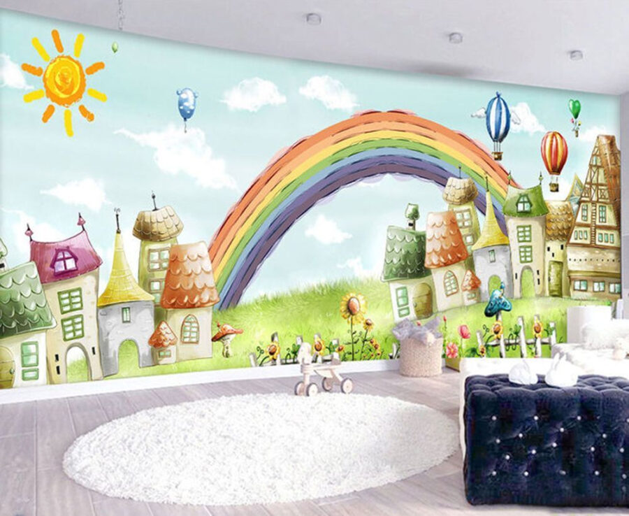 Transform your space with this delightful mural, “Wall Murals Rainbow Over a House.” Picture it—one sunny morning, you sip coffee while gazing at vibrant homes and a cheerful rainbow splashing color across the walls. It’s like a scene from a fairytale, where every glance brings a smile. Whether it’s a kids’ room or a cozy living area, this mural invites warmth and whimsy. Imagine family and friends gathered, sharing laughs and stories, all framed by this playful landscape. Plus, it gives off those feel-good vibes—who doesn’t want a rainbow over their house? Brighten up and let the good times roll!
