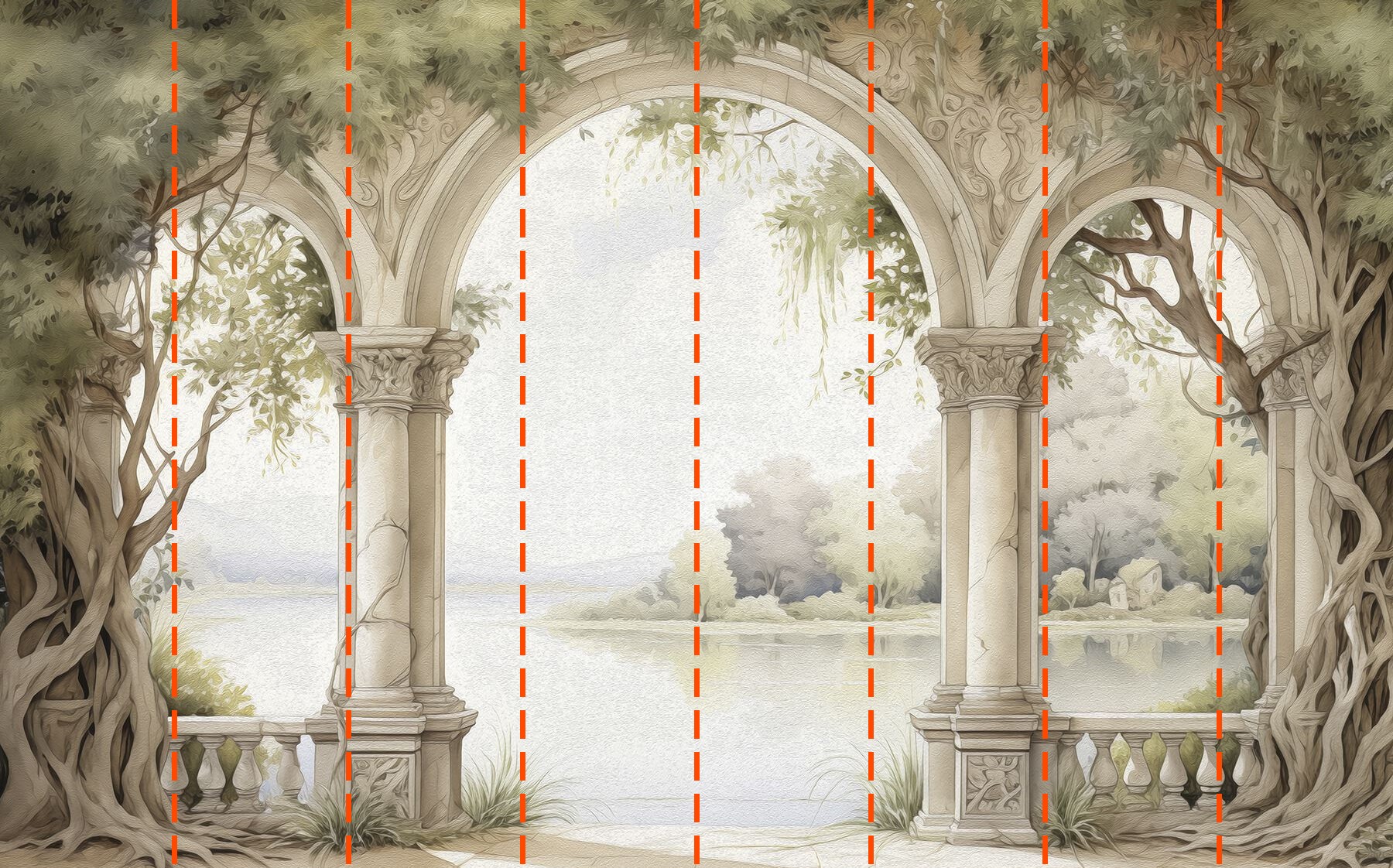 Papier peint Aquarelle d'une arche en pierre avec des arbres et un lac