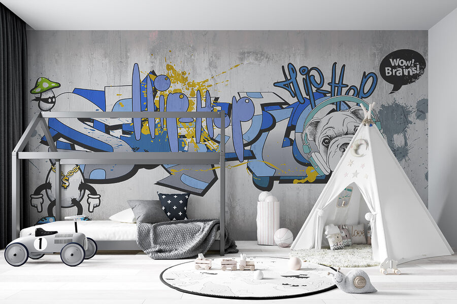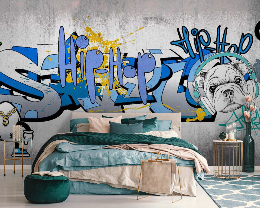Imaginez cet objet bien installé dans un bureau à domicile ou illuminant la chambre d’un adolescent – tout à coup, la pièce semble plus vivante, presque en train de vous parler grâce à son flair créatif. Il y a fort à parier qu’elle sera le point de départ de toutes les conversations ! Les éléments hip-hop, comme l’adorable bouledogue portant un casque et les personnages excentriques, confèrent à cette peinture murale un charme fantaisiste et un peu d’audace. Vous verrez ces touches de couleur et vous vous surprendrez à sourire, entretenant ainsi l’esprit jeune et dynamique qui règne autour de vous.