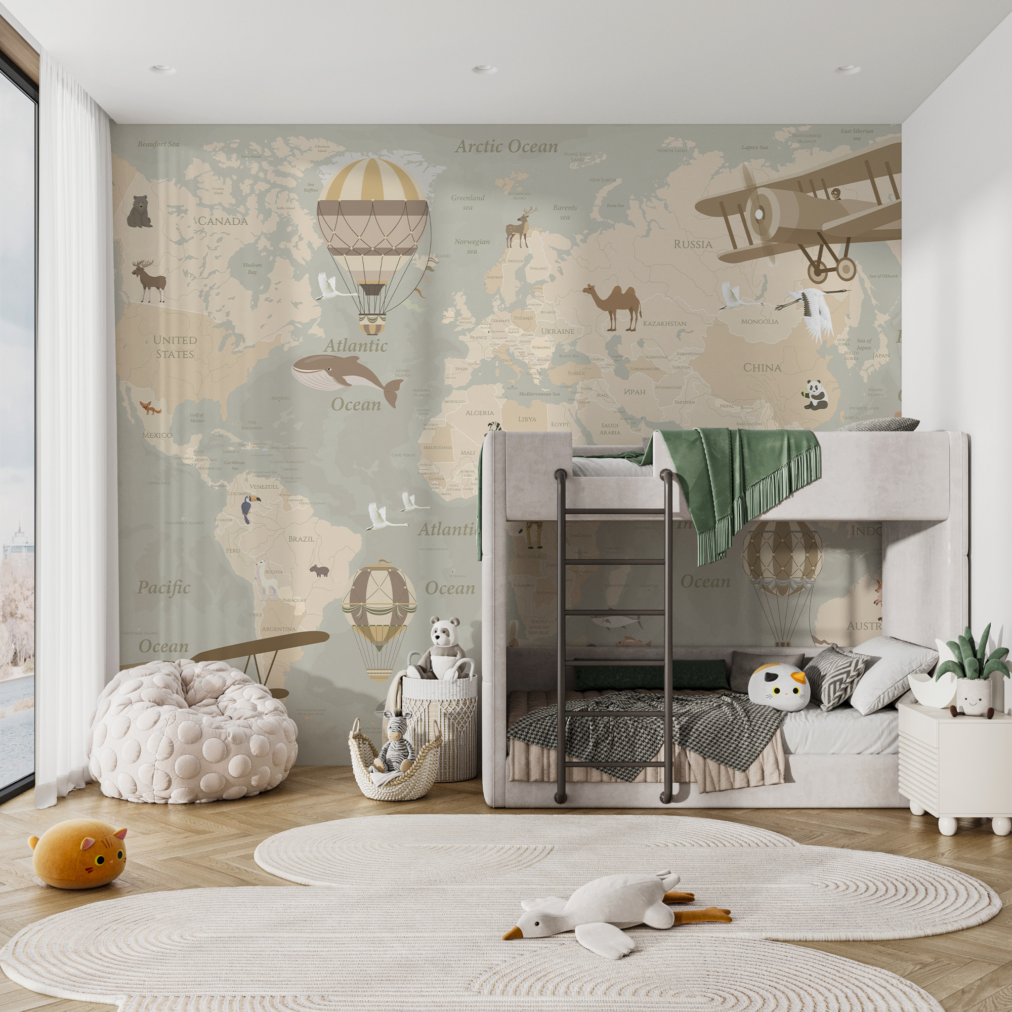 Avez-vous déjà rêvé de faire un voyage autour du monde dans le confort de votre salon ? Cette peinture murale “Carte du monde avec avions et montgolfières” est comme un délicieux voyage en soi – pas besoin de passeport ! Idéale pour les chambres d’enfants, elle donne vie aux continents, aux océans et aux animaux excentriques dans des couleurs douces et discrètes qui n’envahiront pas l’espace.