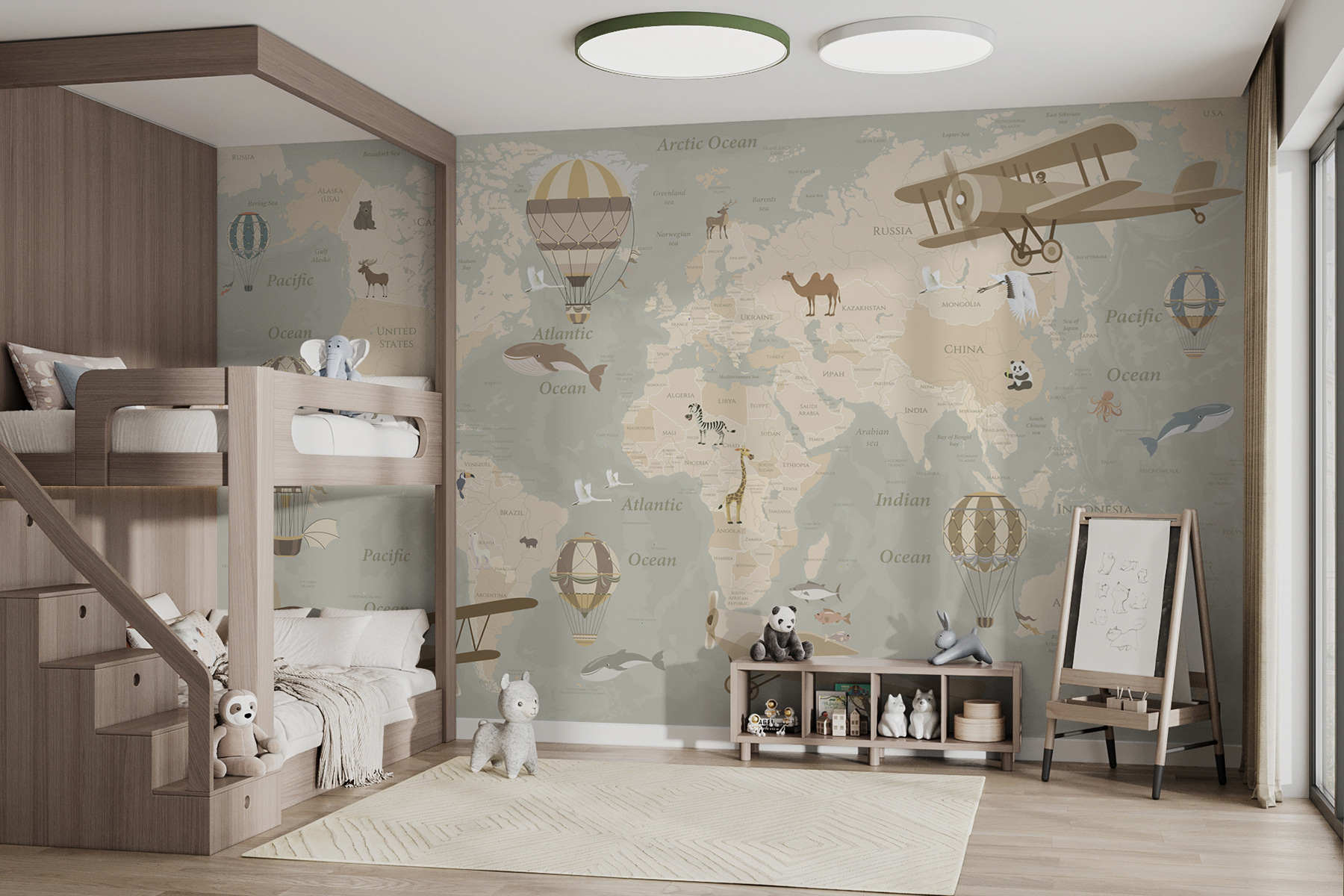 Imaginez votre petit explorateur partir pour des aventures imaginaires : un jour, il survole l’Afrique en biplan et le lendemain, il flotte dans une montgolfière au-dessus de l’Australie. C’est l’idéal pour éveiller la curiosité et transformer les murs en une toile de rêve. De plus, il a un petit côté vintage que les adultes peuvent aussi apprécier, comme une œuvre d’art et une leçon de géographie réunies en une seule. À la fois fantaisiste et éducatif, il fait de chaque coup d’œil une mini-vacance. Alors, pourquoi se contenter de murs sobres quand on peut avoir tout un monde qui attend d’être exploré ?