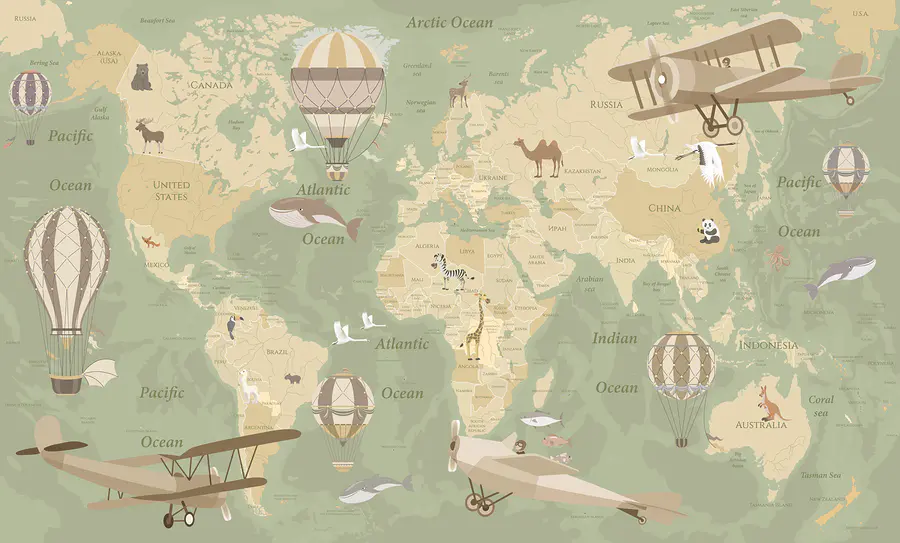 Les enfants adoreront suivre des vols imaginaires et repérer les animaux mignons disséminés sur les continents. C’est un peu comme leur propre émission du National Geographic, la télé en moins ! Et ce n’est pas seulement pour les petits. Cette peinture murale ajoute une touche d’émerveillement pour tous ceux qui aiment l’errance et le charme vintage.