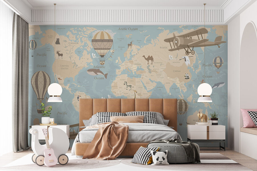 Transformez votre espace avec cette charmante peinture murale d’une carte du monde remplie d’avions et de montgolfières fantaisistes. C’est comme une invitation à l’aventure sur votre mur ! Imaginez des week-ends paresseux passés à rêver de plans de voyage ou à partager des histoires de pays lointains avec des amis, tout en contemplant des illustrations douillettes de baleines et de pandas enjoués.