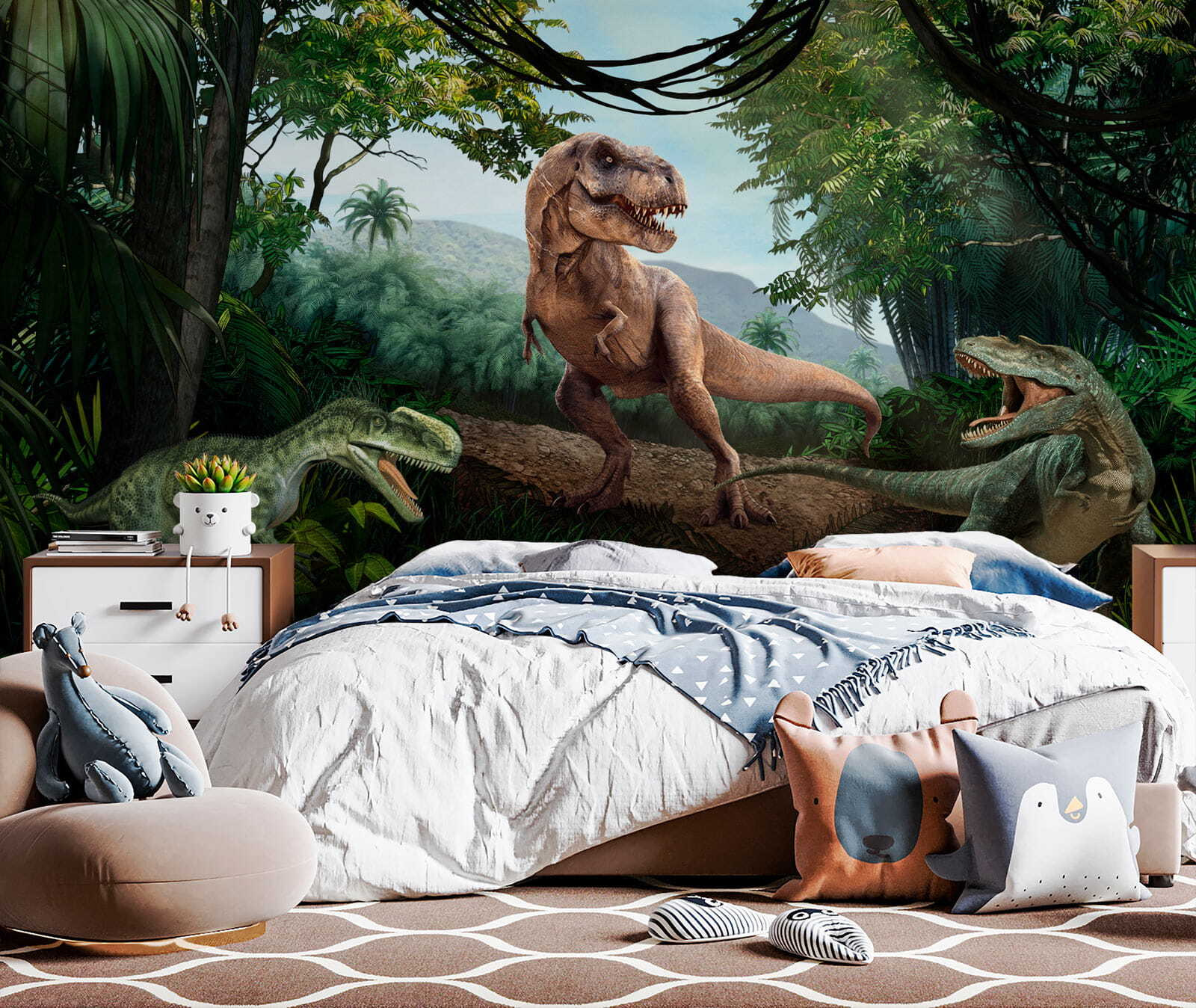 Votre enfant est obsédé par les dinosaures ? Ou peut-être aimez-vous simplement transformer des murs ennuyeux en conversations époustouflantes ? Plongez dans le Jurassique avec cette peinture murale vibrante et réaliste – c’est comme votre propre machine à remonter le temps ! Imaginez que vous vous réveillez avec un T-Rex tous les jours (sans la partie effrayante, bien sûr). Parfait pour les chambres d’enfants, les aires de jeux ou même le bureau à la maison, ce mural est une véritable source d’inspiration. L’effet 3D donne une incroyable impression de profondeur, comme si vous pouviez entrer directement dans ces jungles luxuriantes. Prêt à libérer la magie préhistorique ? Rawr-some !