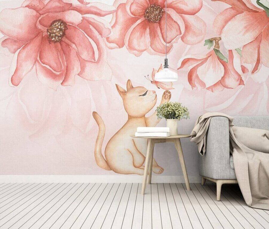 Transformez votre espace avec cette ravissante fresque murale représentant un chat fantaisiste qui tente d’attraper un papillon. Le style aquarelle doux et les fleurs roses délicates créent une atmosphère onirique qui donne l’impression de se promener dans un jardin ensoleillé. Vous imaginez déjà des après-midis de rêve passés à siroter une tasse de thé, ou peut-être une soirée dansante improvisée ? Cette fresque apporte charme et touche de magie à n’importe quelle pièce. Que ce soit pour un coin douillet ou une chambre d’enfant fantaisiste, elle ne manquera pas de susciter des sourires et de la chaleur. Qui ne voudrait pas se sentir comme dans un livre d’histoires ?