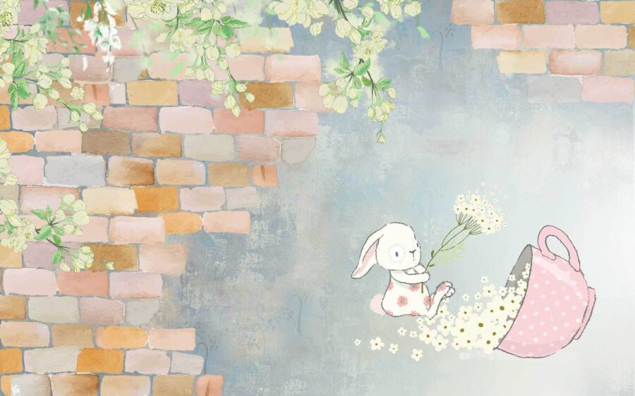 Papier peint Lapin de dessin animé et maison avec fleurs (UGS: u38904)