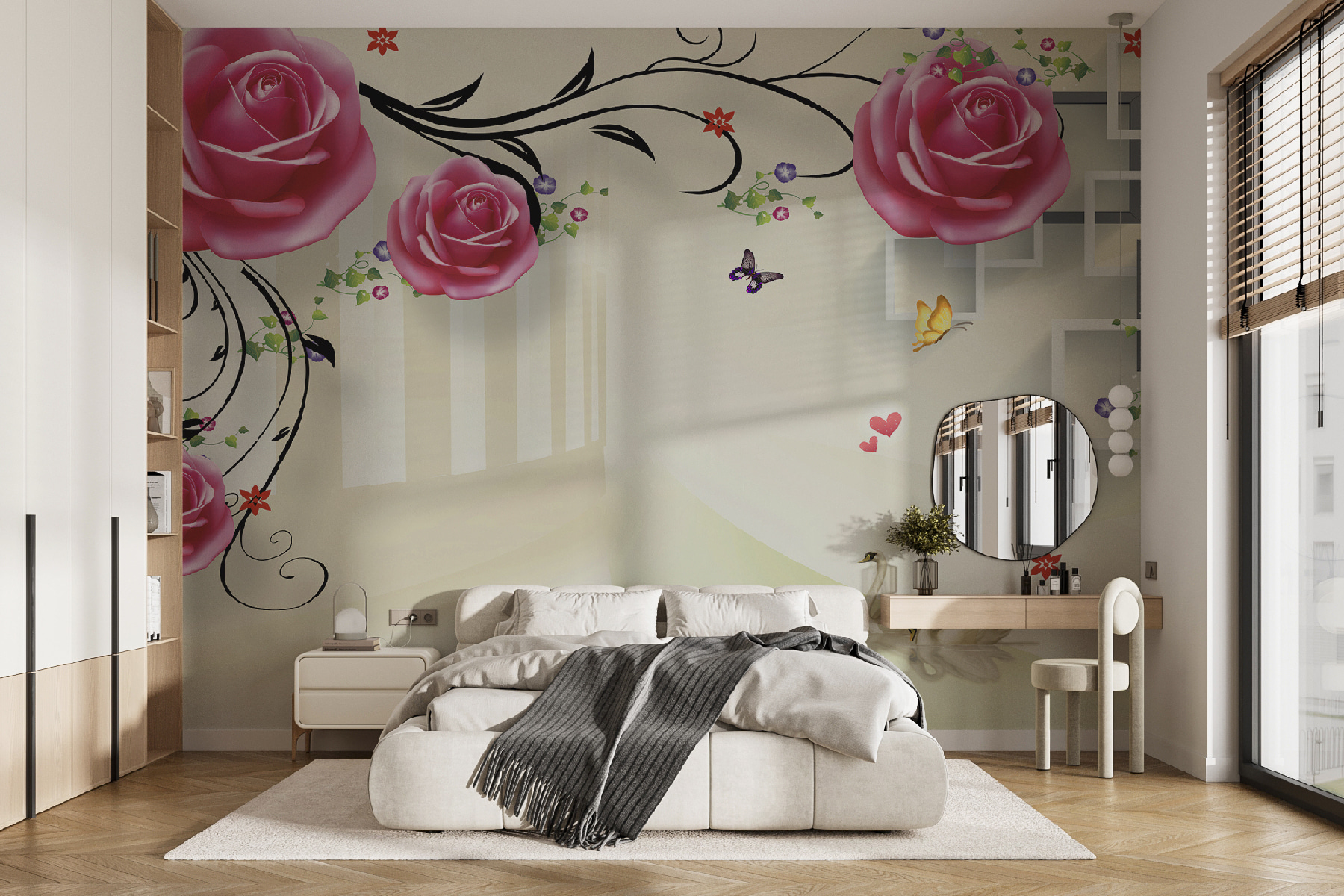 Imaginez que vous vous réveillez tous les jours devant cette peinture murale envoûtante – c’est comme si vous entriez dans un jardin de rêve ! Des cygnes glissant gracieusement sous des roses en fleurs, avec des papillons voletant autour, donnent à votre espace une touche de magie sereine. Parfait pour tous ceux qui souhaitent apporter un peu de nature à l’intérieur avec une touche d’élégance. Et ces roses, on dirait presque qu’on peut les toucher !