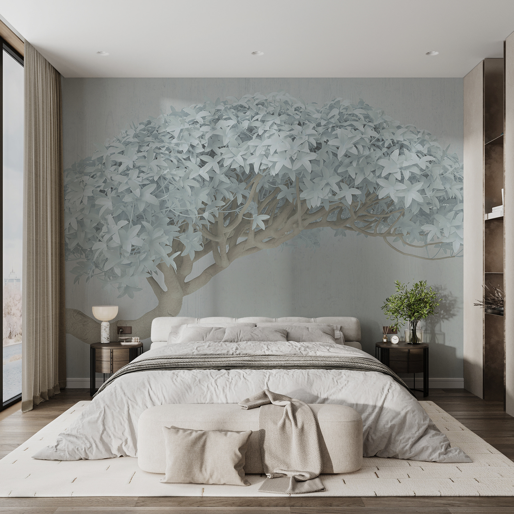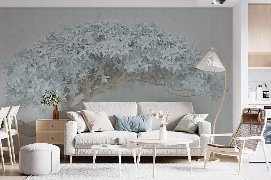 Cette peinture murale a quelque chose de presque fantaisiste – elle transforme un mur ordinaire en une histoire captivante. Vos amis entreront dans la pièce et se demanderont : “Où as-tu trouvé cette superbe peinture murale ?”. C’est un mélange parfait d’élégance et d’apaisement, un peu comme si vous sirotiez un thé enveloppé dans une couverture douillette. Et puis, ces feuilles ! On dirait qu’elles pourraient bruisser doucement si une brise traversait votre salon. Le blanc doux de l’arbre apporte une sensation de fraîcheur et d’apaisement qui fait de chaque coup d’œil une mini-vacance mentale… Peut-on faire mieux en matière de décoration ?