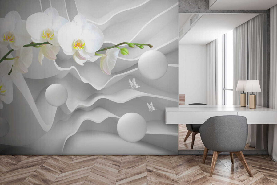 Imaginez cette “boule blanche sur une surface blanche” murale dans votre salon – c’est comme avoir un jardin serein qui n’a jamais besoin d’être arrosé ! Ces délicates fleurs blanches se détachant sur le fond doux et fluide ajoutent instantanément une touche de tranquillité… et, soyons honnêtes, un soupçon de sophistication aussi. Parfait pour créer une oasis de calme dans votre maison, en particulier dans un coin lecture confortable ou au-dessus du lit.