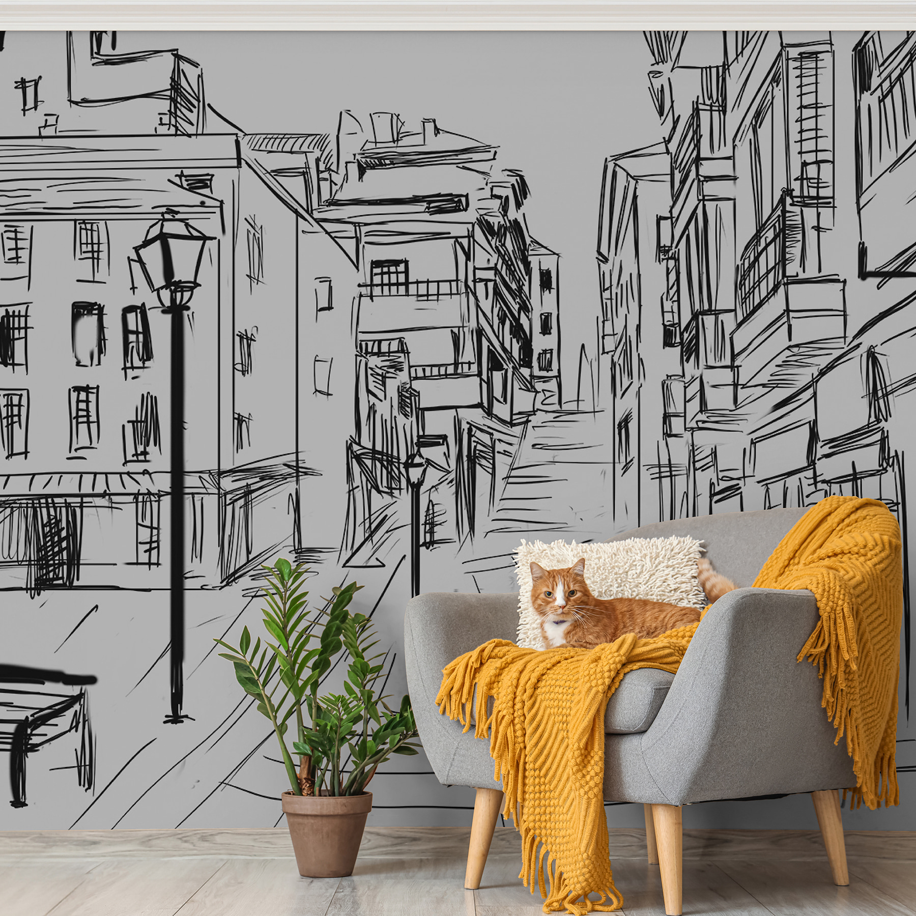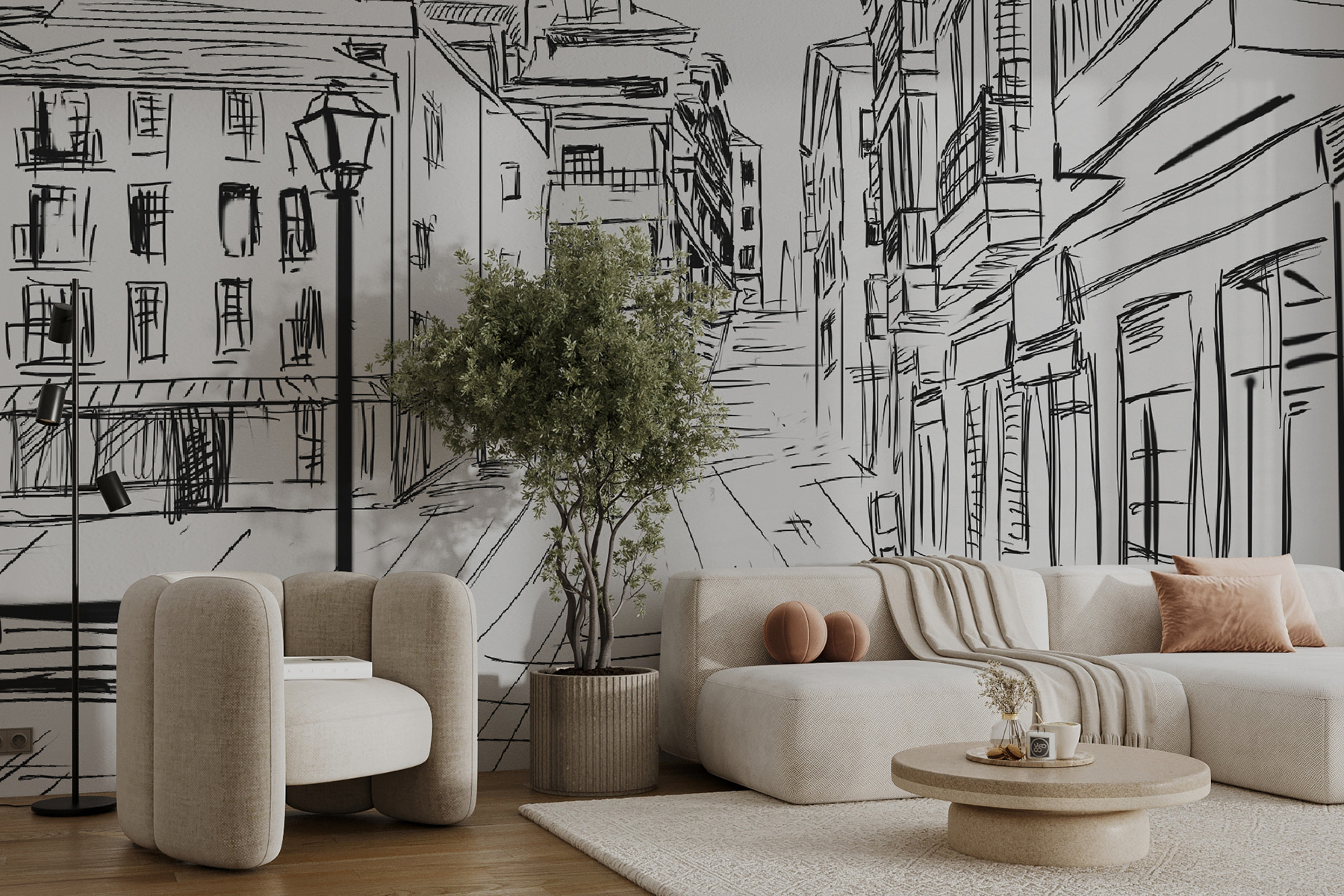 Imaginez que vous vous prélassiez dans votre salon avec cette superbe peinture murale en noir et blanc sur votre mur. C’est comme un croquis fantaisiste qui prend vie ! Les lignes ludiques capturant une scène urbaine – avec un banc solitaire et des bâtiments imposants – apportent une touche artistique qui vous fera rêver des rues européennes.