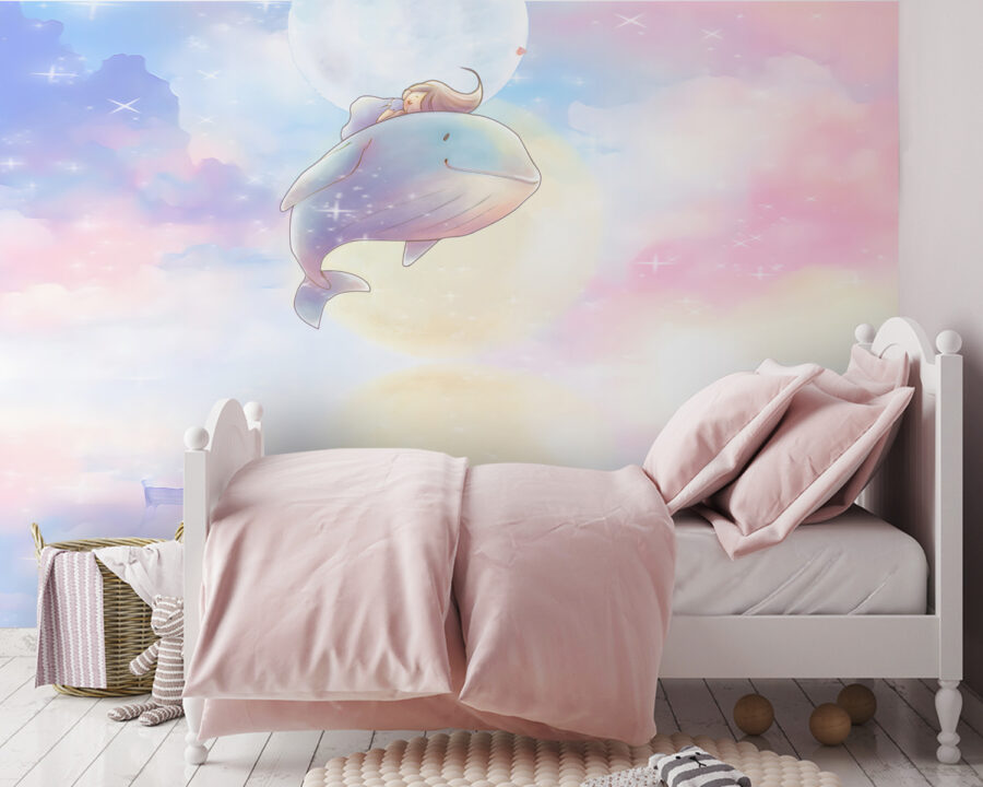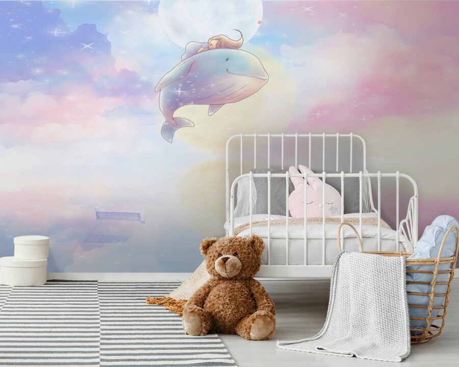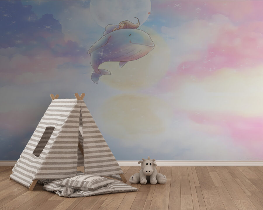 Rencontrez votre nouveau meilleur ami mural – la peinture murale “Dessin animé d’une baleine” ! Cette scène de rêve est comme un petit voyage dans un monde magique, où une baleine sympathique accompagne votre enfant à travers des nuages pastel et floconneux. Parfait pour la chambre d’une fille ou tout autre espace créatif !