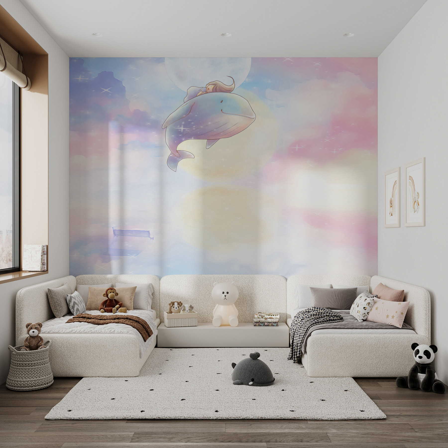 Rencontrez votre nouveau meilleur ami mural – la peinture murale “Dessin animé d’une baleine” ! Cette scène de rêve est comme un petit voyage dans un monde magique, où une baleine sympathique accompagne votre enfant à travers des nuages pastel et floconneux. Parfait pour la chambre d’une fille ou tout autre espace créatif !
