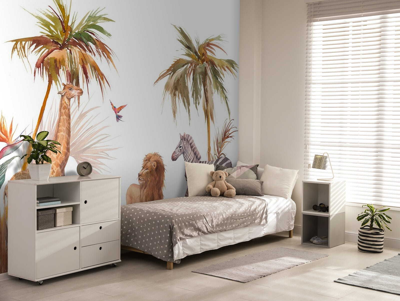Vous cherchez à ajouter un peu de magie de la jungle à votre chambre ? Cette “Aquarelle murale d’un zèbre” pourrait bien faire l’affaire. Imaginez : un zèbre vibrant, une girafe curieuse et même un lion majestueux se promenant parmi des arbres tropicaux. Chaque fois que vous entrez dans la pièce, vous avez l’impression de faire une mini-vacance dans la jungle. Le style aquarelle donne une impression de douceur et d’hospitalité, comme si ces animaux avaient été peints spécialement pour votre espace. Parfait pour tous ceux qui sont un peu sauvages dans l’âme, ou qui aiment simplement une décoration unique et charmante. Imaginez-les dans une chambre d’enfant ou même dans un coin lecture douillet – de l’aventure à l’état pur ! De plus, il s’agit d’un produit pelable et autocollant, donc très facile à installer. Pas de désordre, pas d’ennui, juste des vibrations de jungle instantanées !
