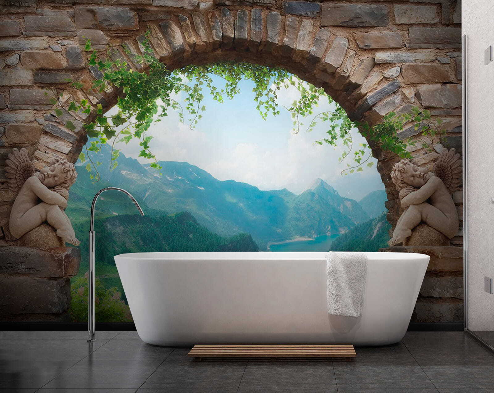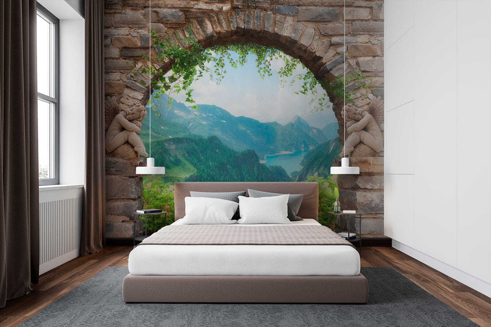 Imaginez que vous franchissez une arche de pierre rustique qui mène directement à une vue imprenable sur la vallée. Cette peinture murale n’est pas seulement une décoration ; elle suscite une petite aventure chaque jour. Imaginez que vous sirotiez votre café du matin en contemplant la verdure luxuriante et l’eau scintillante en contrebas. Les chérubins enjoués de chaque côté ajoutent une touche de fantaisie, donnant l’impression d’une scène tirée d’un conte de fées. Parfaite pour un salon ou un coin douillet, cette peinture murale transforme n’importe quel espace en une évasion de rêve. C’est comme si vous aviez un petit morceau de nature sur votre mur, invitant sans effort un sentiment de calme et d’émerveillement dans la vie quotidienne. N’oubliez pas d’arroser ces plantes imaginaires !
