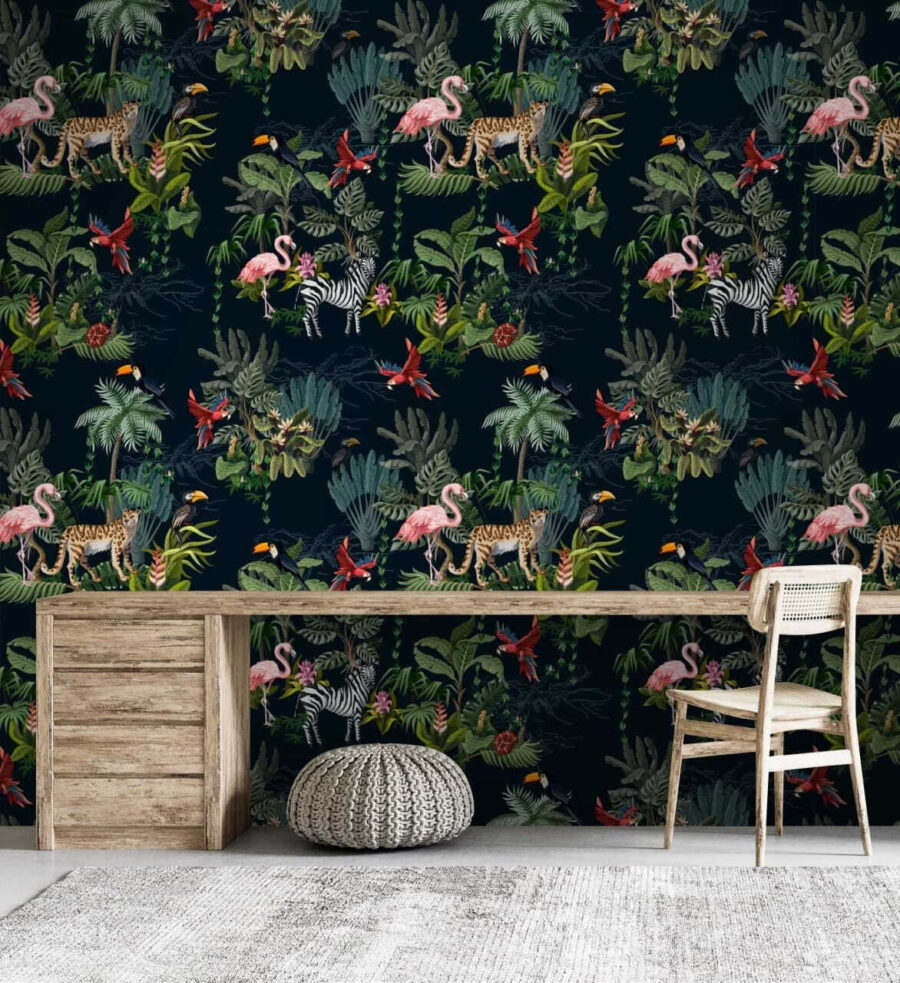 Transformez n’importe quel mur en une escapade vibrante grâce à cette superbe fresque murale représentant des flamants roses et des zèbres au milieu d’une végétation tropicale luxuriante. C’est comme si vous apportiez un petit bout de nature sauvage dans votre salon, ou dans votre salle de bain, si vous vous sentez audacieux ! Imaginez-vous plonger dans une jungle luxuriante chaque fois que vous passez devant. Les couleurs riches ressortent sur un fond plus sombre, ce qui en fait la toile de fond parfaite pour des réunions chaleureuses ou pour se détendre seul. De plus, c’est un excellent sujet de conversation : qui n’aime pas discuter de la faune exotique ? Cette fresque murale n’est pas seulement une décoration, c’est une expérience. Alors, embellissez ce mur uni et laissez la jungle s’inviter chez vous !
