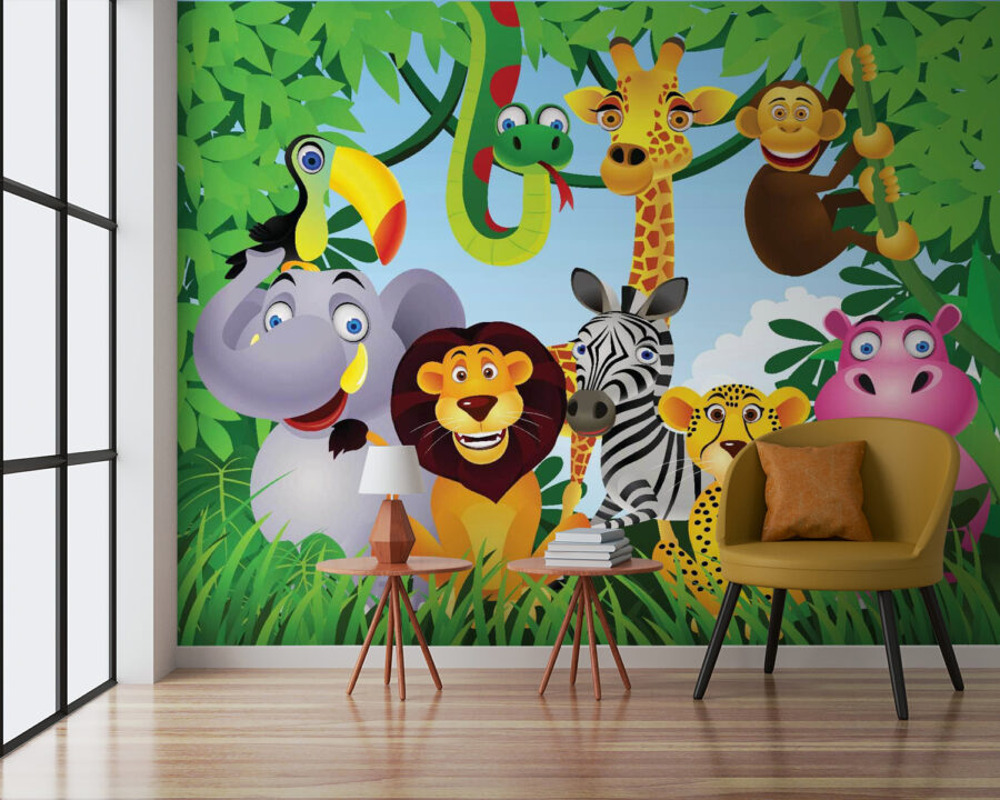 Transformez n’importe quel espace en une aventure jungle animée grâce à cette joyeuse fresque murale représentant une troupe d’animaux pleins de vie. Imaginez un éléphant au sourire malicieux, une girafe dansante et un vieux lion sage, chacun débordant de personnalité ! Cette fresque n’est pas seulement un élément décoratif, c’est une porte ouverte sur l’imaginaire. Les enfants adoreront repérer leurs créatures préférées, tandis que les adultes pourront laisser s’exprimer l’enfant qui sommeille en eux. Idéale pour les salles de jeux ou les chambres d’enfants, elle apporte une touche de gaieté et de rire aux murs. Qui ne voudrait pas que son espace ressemble à une fête dans la jungle ? Elle invite littéralement à raconter des histoires sous son dais ludique ! Que la fête commence !