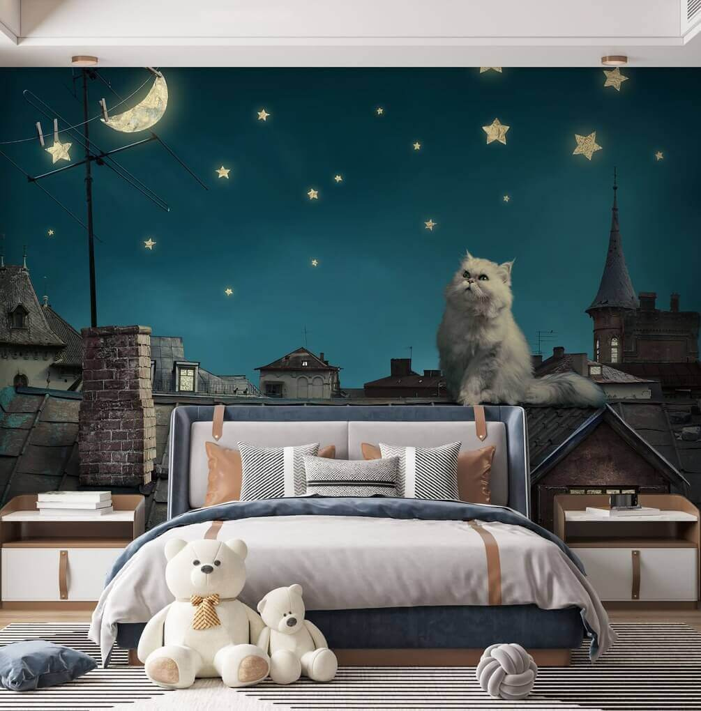 Voici une peinture murale qui vous fera rêver de nuits sur les toits et de ciels étoilés. “Le chat qui contemple le ciel nocturne est tout droit sorti d’une histoire à dormir debout. Imaginez cette scène dans votre salon ou dans la chambre d’un enfant – c’est tellement magique ! Le regard rêveur du chat vers les étoiles est un pur enchantement, une échappée paisible loin de l’agitation. Les enfants adoreront l’ambiance ludique, les adultes l’esthétique apaisante. C’est un mélange de charme abstrait et d’émerveillement enfantin, parfait pour stimuler l’imagination. De plus, qui pourrait résister à cet adorable félin duveteux qui regarde la nuit avec curiosité ?