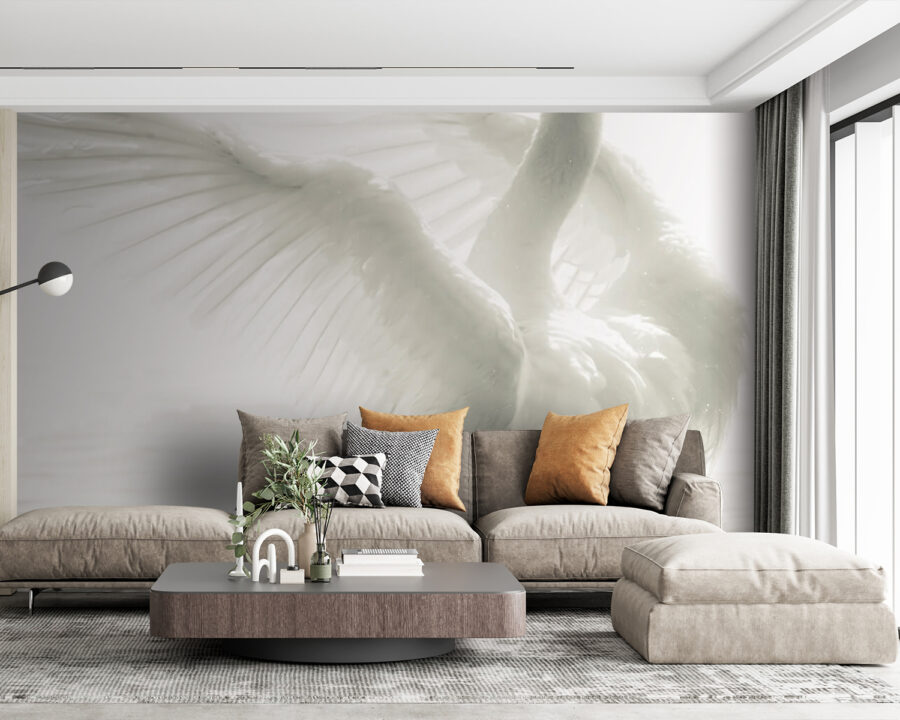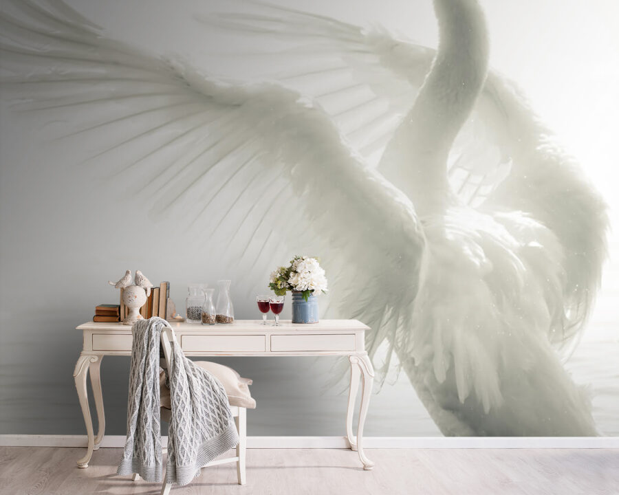 Transformez votre espace avec cette superbe peinture murale d’un cygne blanc déployant ses ailes dans des eaux tranquilles. Elle apporte une ambiance à la fois sereine et saisissante, parfaite pour un salon ou un coin paisible où vous sirotez votre café du matin. Imaginez que vous regardiez cette peinture et que vous vous sentiez vous-même comme un oiseau gracieux, s’élevant au-dessus de l’agitation quotidienne. Le doux mouvement de ses ailes invite au calme et au charme. C’est comme si vous aviez un morceau de nature sur votre mur – pas de plumes à nettoyer ! Cette peinture murale est un sujet de conversation qui ne manquera pas d’attirer l’attention et de susciter des sourires. Parfaite pour ceux qui apprécient l’art qui murmure la beauté et l’élégance.