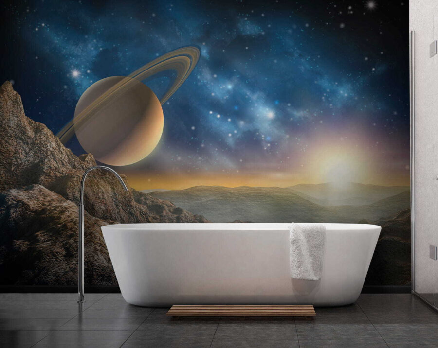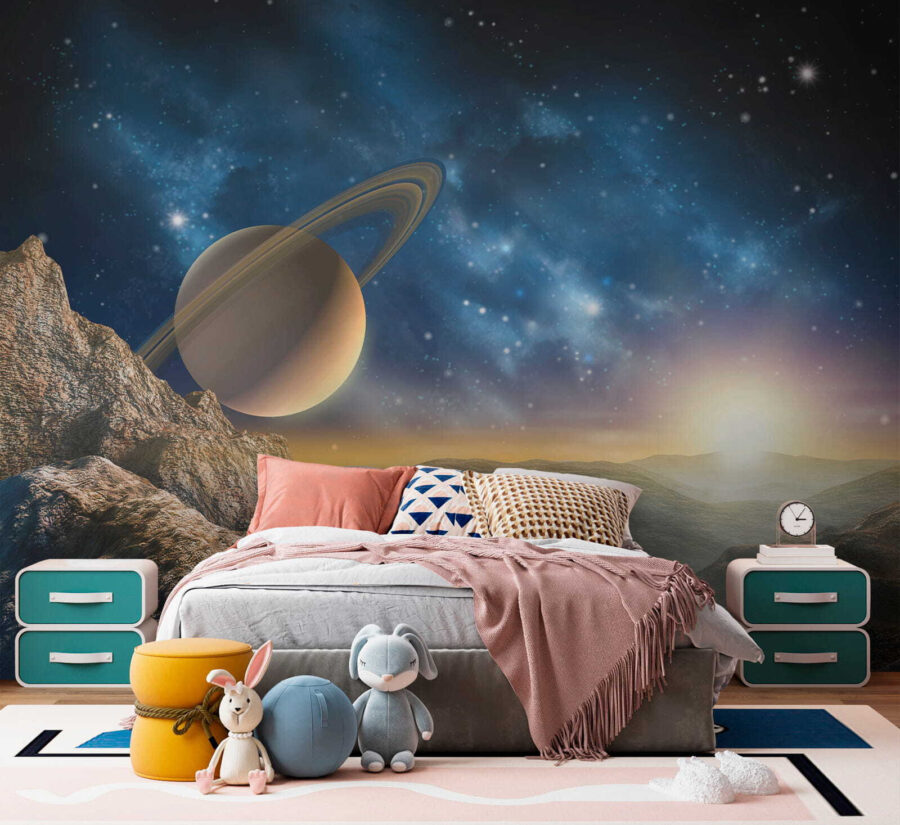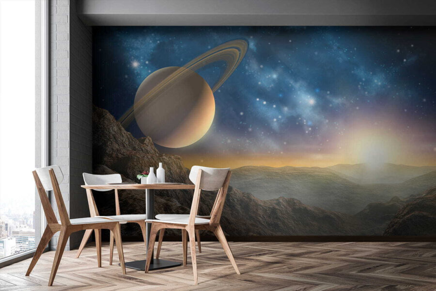 Transformez un mur ordinaire en une évasion céleste avec la « fresque murale Planète avec anneaux dans le ciel ». Cette superbe fresque vous emmène dans un paysage de rêve, où des montagnes majestueuses rencontrent une planète impressionnante ornée d’anneaux fabuleux. Imaginez-vous confortablement installé dans un salon où le soleil matinal brille, projetant une lueur chaleureuse sur cette scène cosmique. C’est comme avoir un morceau de l’univers chez soi ! Vos amis entreront dans la pièce et resteront bouche bée, tandis que vous siroterez tranquillement votre thé, vous sentant comme un explorateur intergalactique. Parfait pour tous ceux qui aiment contempler les étoiles ou qui souhaitent simplement insuffler une touche d’inspiration cosmique à leur espace — voilà qui fera naître la conversation !