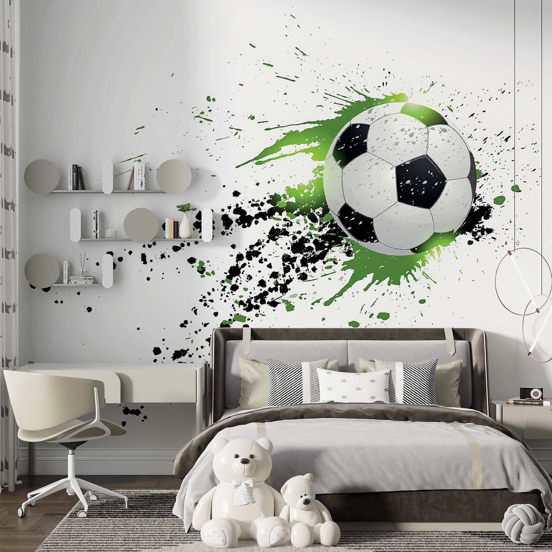 Bonjour à tous ! Imaginez un peu : une explosion de couleurs et un ballon de foot volant sur votre mur. C’est ce que vous obtenez avec la peinture murale “Ballon de football avec éclaboussures artistiques”. C’est comme si quelqu’un avait capturé le moment parfait et plein d’action d’un match, l’avait figé dans le temps, puis y avait ajouté une touche artistique. Les éclaboussures vertes et noires lui confèrent une ambiance si vivante et amusante. La chambre de votre enfant se transformera instantanément en un havre de paix sportif et cool. Et honnêtement, même vos amis pourraient l’envier ! Vous pouvez pratiquement entendre les acclamations et ressentir l’excitation à chaque fois que vous la regardez. Tout à fait idéal pour les jeunes fanatiques de football qui rêvent de grand, n’est-ce pas ?