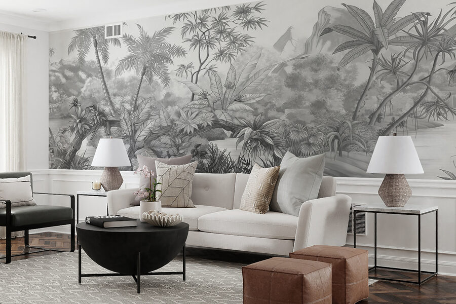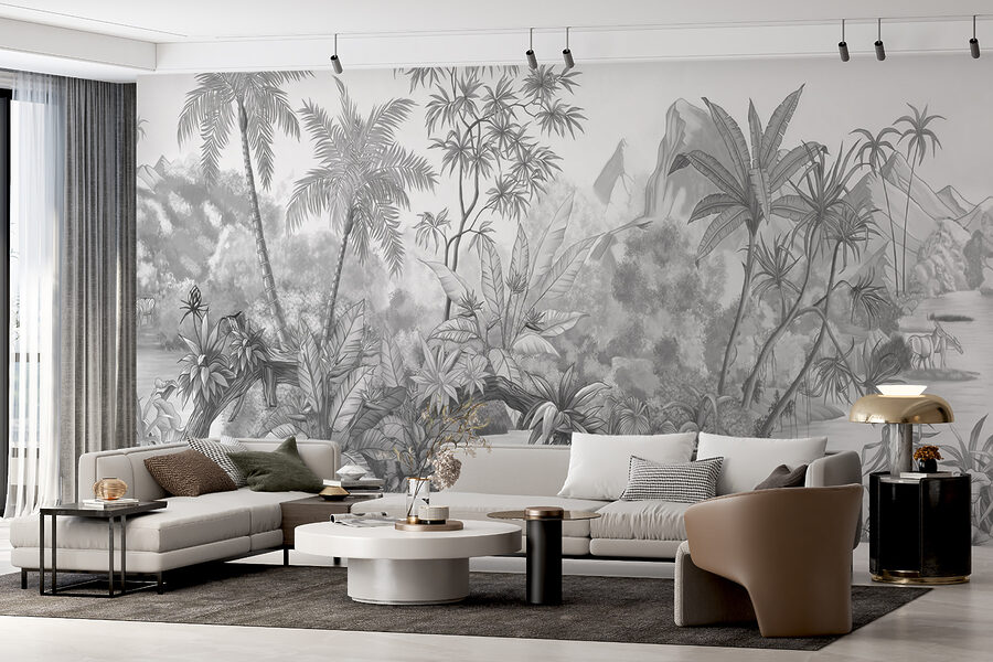 Entrez dans votre propre aventure dans la jungle avec cette peinture murale “Dessin d’un zèbre”. C’est comme si vous ouvriez une porte secrète vers un paradis tropical serein, directement dans votre espace de vie. Imaginez qu’à chaque fois que vous levez les yeux, vous contemplez des zèbres enjoués au bord de l’eau et un feuillage luxuriant et détaillé qui murmure presque des secrets tropicaux. C’est l’élégance du noir et blanc avec une touche de charme sauvage.