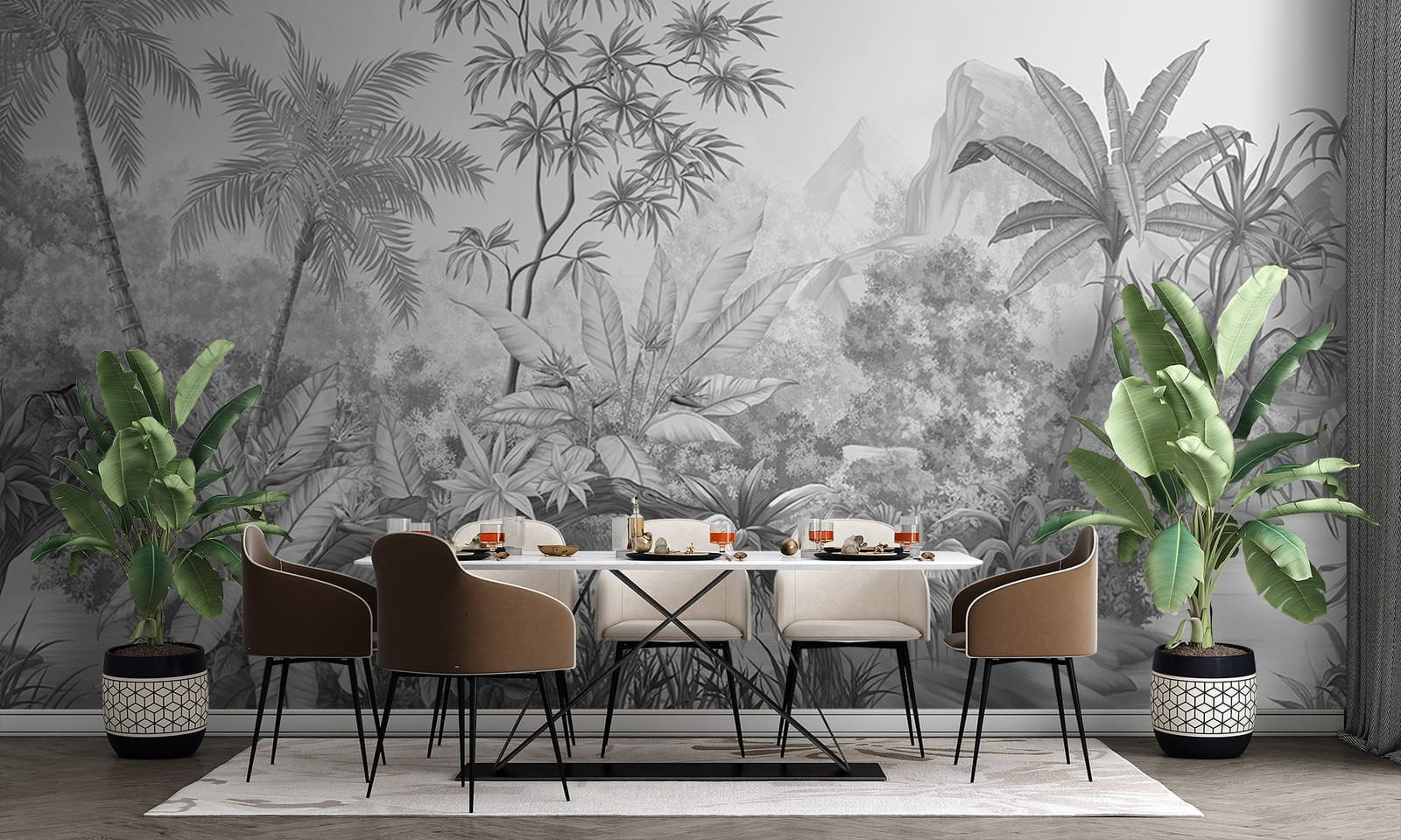 Entrez dans votre propre aventure dans la jungle avec cette peinture murale “Dessin d’un zèbre”. C’est comme si vous ouvriez une porte secrète vers un paradis tropical serein, directement dans votre espace de vie. Imaginez qu’à chaque fois que vous levez les yeux, vous contemplez des zèbres enjoués au bord de l’eau et un feuillage luxuriant et détaillé qui murmure presque des secrets tropicaux. C’est l’élégance du noir et blanc avec une touche de charme sauvage.