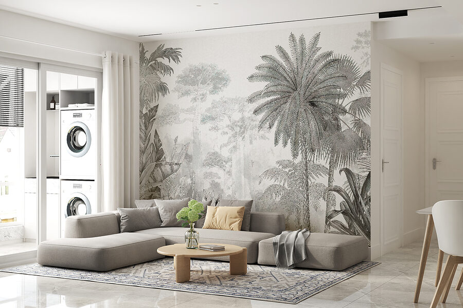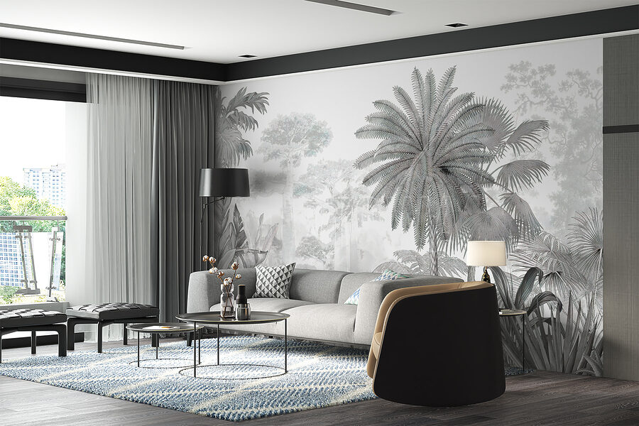 Cette peinture murale présente un mélange fascinant de palmiers et de feuilles de jungle, créant une profondeur et une sensation d’immersion dont nous avons tous secrètement envie. Imaginez que vous entrez dans votre salon et que vous avez l’impression d’être sorti de l’agitation et d’être entré dans un paradis tropical de rêve. Il s’agit d’un mur d’expression idéal, et les tons monochromes le rendent sophistiqué, sans pour autant l’écraser.