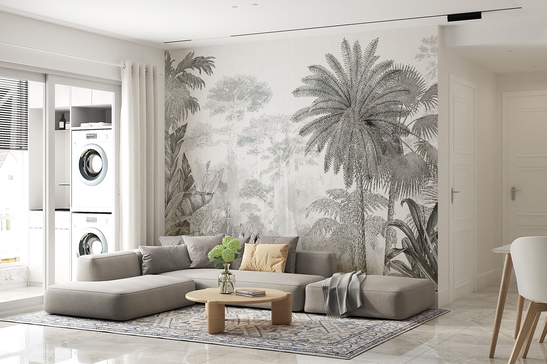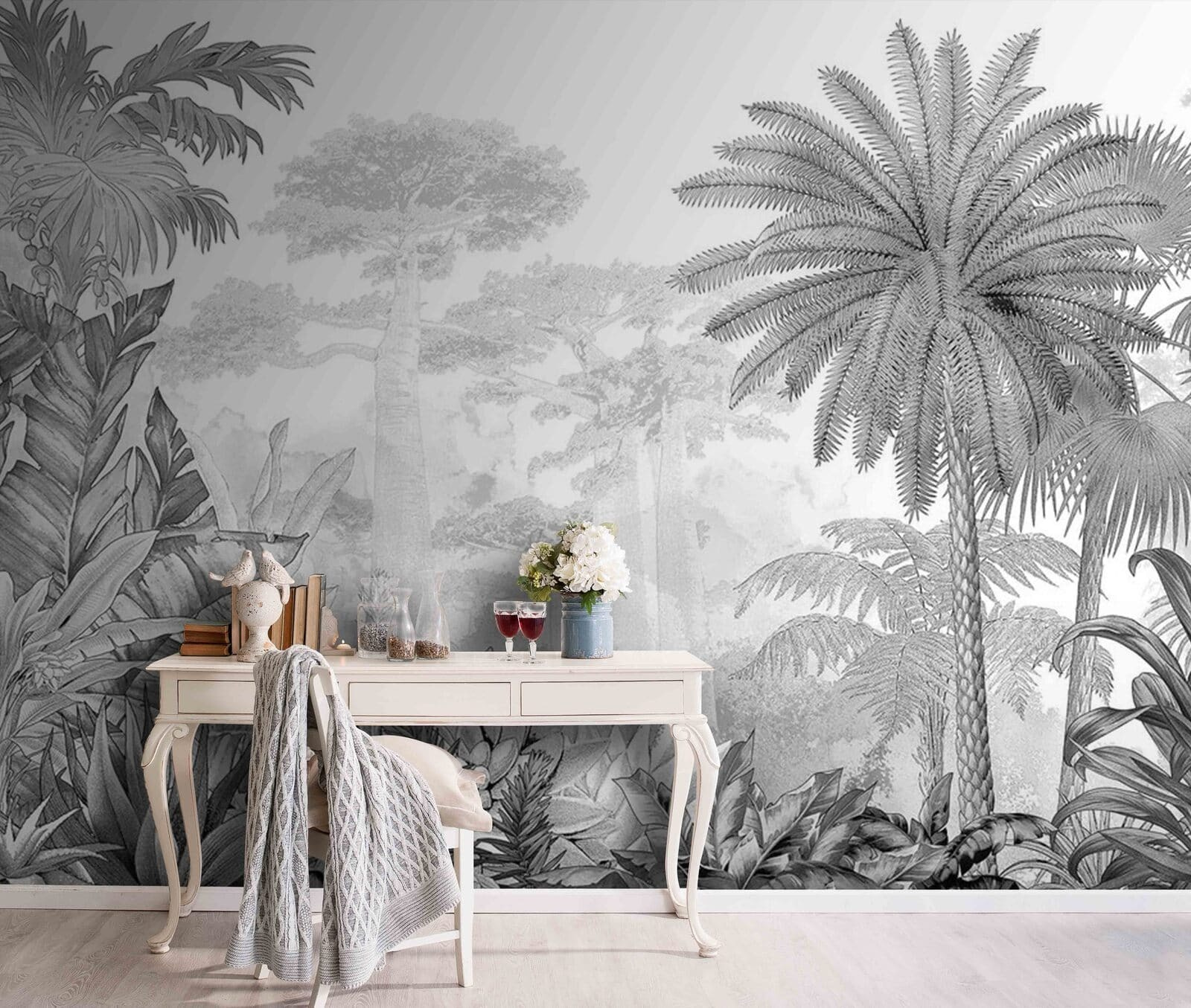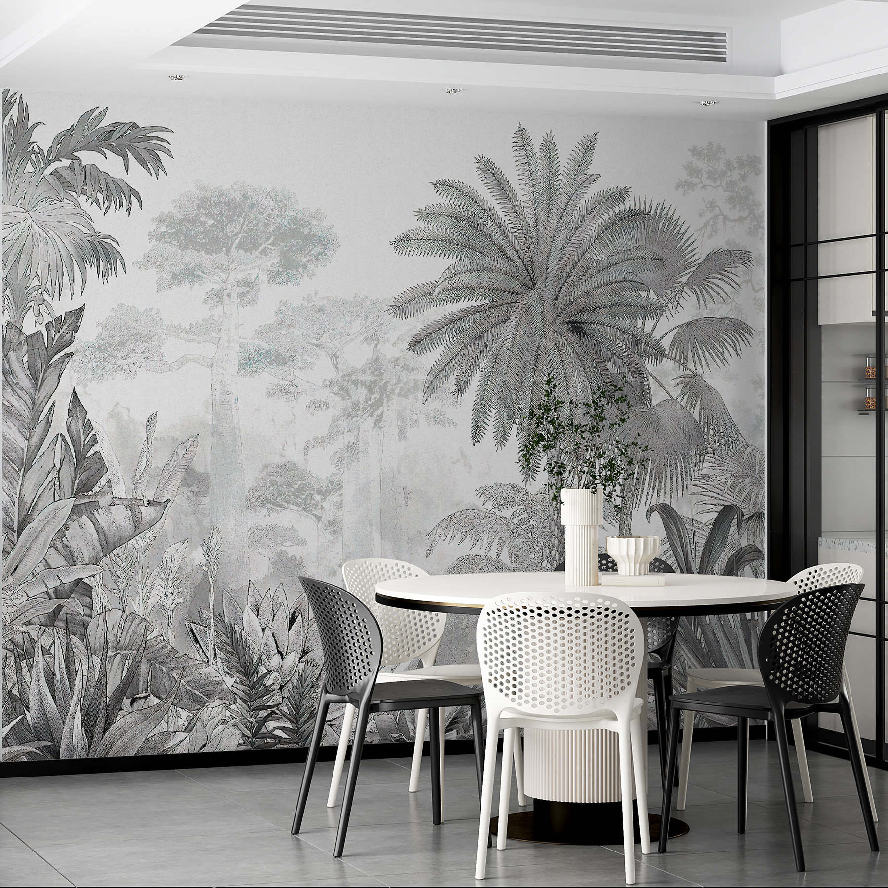 Cette peinture murale présente un mélange fascinant de palmiers et de feuilles de jungle, créant une profondeur et une sensation d’immersion dont nous avons tous secrètement envie. Imaginez que vous entrez dans votre salon et que vous avez l’impression d’être sorti de l’agitation et d’être entré dans un paradis tropical de rêve. Il s’agit d’un mur d’expression idéal, et les tons monochromes le rendent sophistiqué, sans pour autant l’écraser.